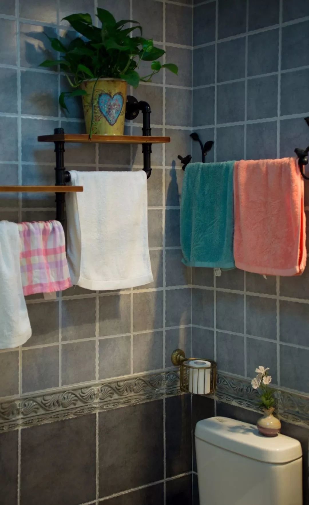 ▲深蓝色墙脚大砖+蓝色墙身小砖,中间还以腰线过渡,让空间显得层次而又有异域风情感
