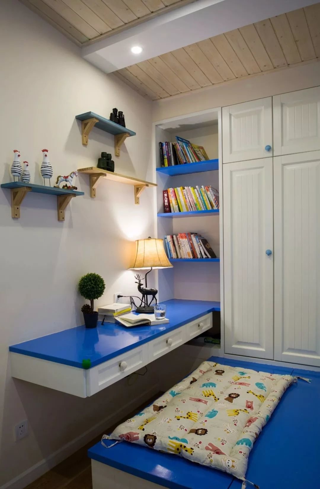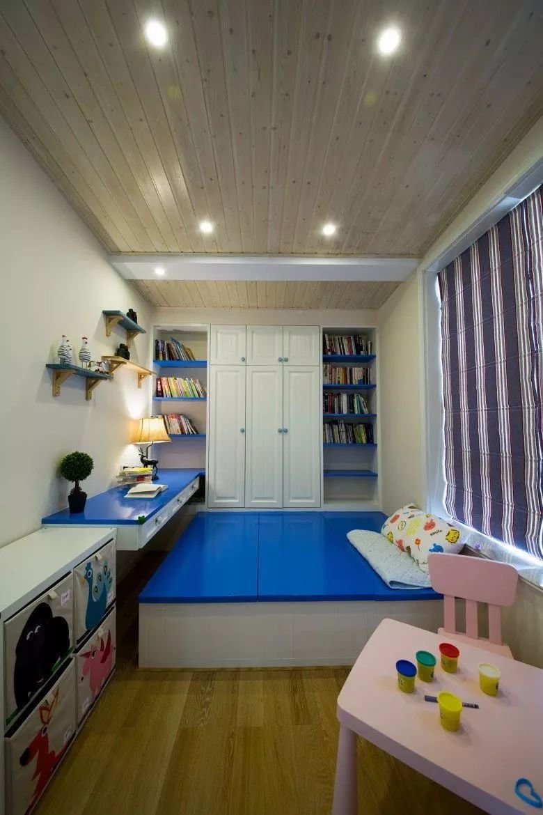 ▲儿童房采取定制家具设计,榻榻米床+床尾书桌,侧边装上衣柜+书架组合,在书桌上方加入展示架,摆上精致小饰品与台灯,在蓝色的台面空间下,也让空间有着地中海风情的气息。