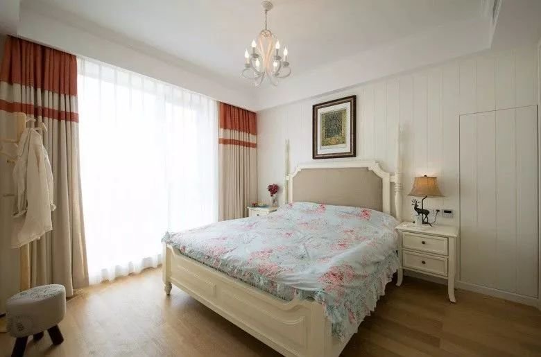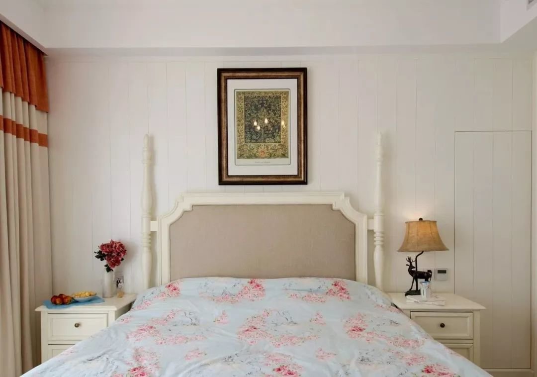 ▲次卧以暖色调的空间基础,床头墙是木饰面+隐形门设计,布置上象牙白色的床铺、床头柜,铺设花纹图案床单,让空间显得浪漫温馨而唯美。
