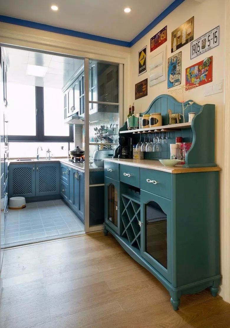 ▲厨房门口装一个餐边柜,这里既可以作为收纳,又能充当料理台空间,蓝色柜子结合精致的细节布置,让生活充满情趣格调的气质。