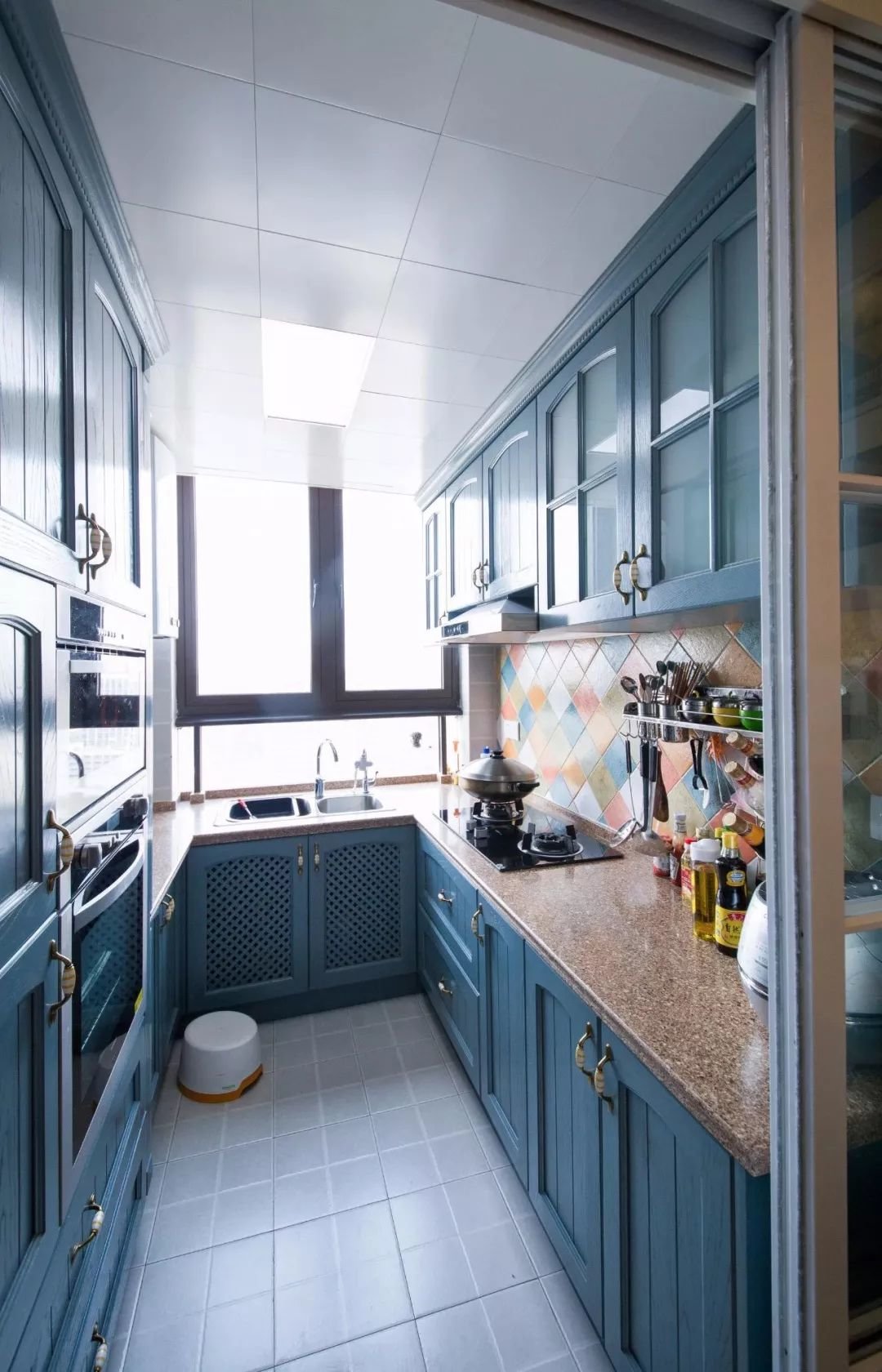 ▲厨房橱柜是U字形的操作台,以斜拼拼色墙面砖融入黄色、棕色、蓝色与白色,在以蓝色橱柜为主调,布置出一个充满田园自然气息的厨房空间。