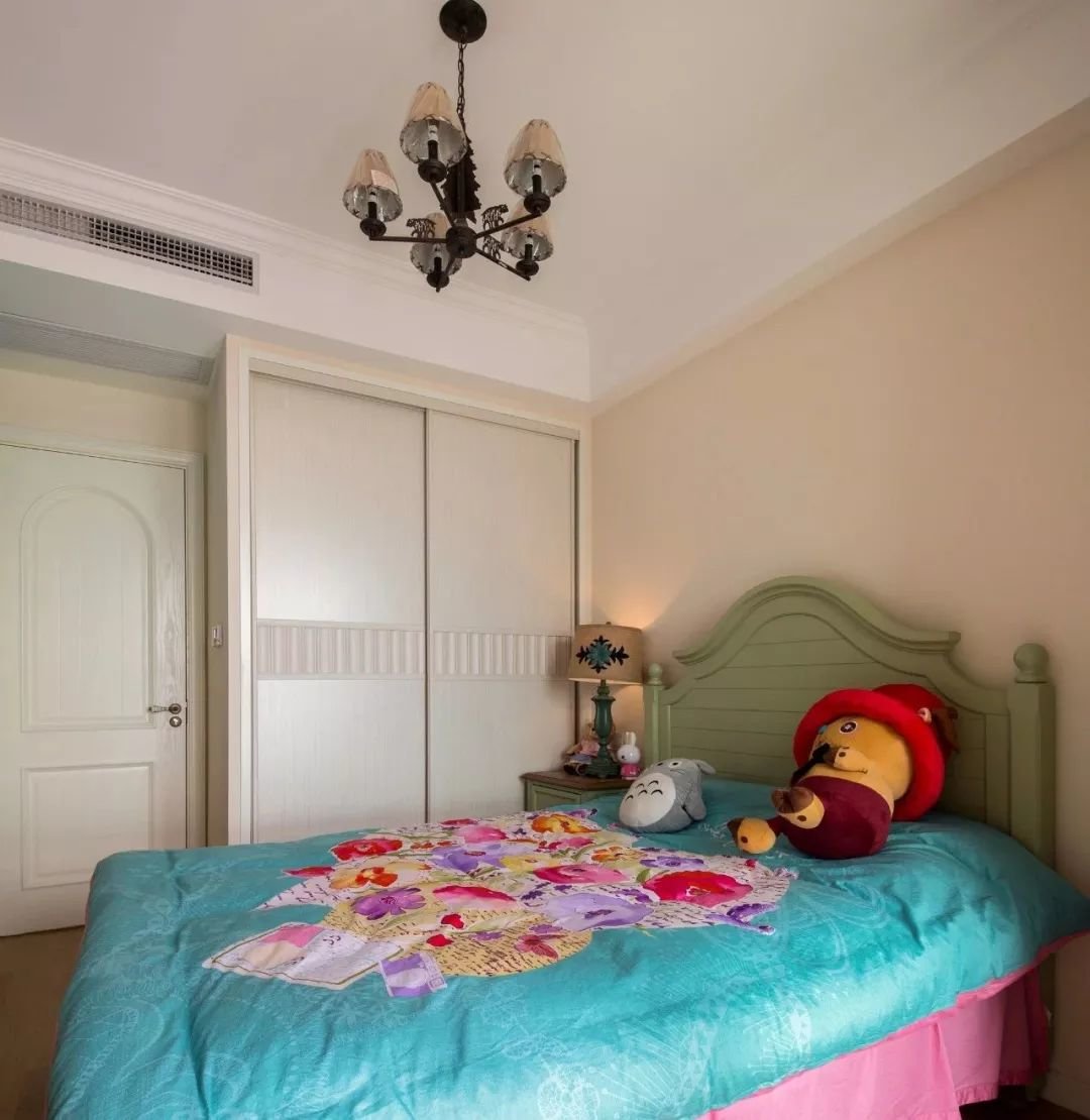 ▲在卧室中,一张草绿色的床,让空间充满清新文艺感,给人生机勃勃的氛围,给整个房间注入了活力;墙体采用了淡粉色的调色,颜色柔和而温暖,为房间增添了一丝浪漫的氛围。白色衣柜与墙体相得益彰,它的简洁设计与床的鲜艳形成了鲜明的对比。