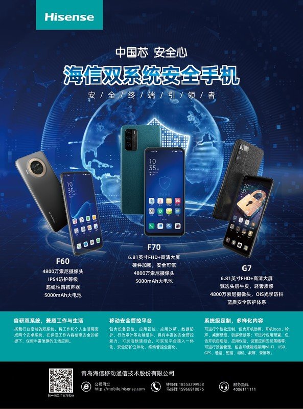 为满足客户的需求,海信自主研发了3款双系统安全手机,分别为海信双系统安全手机F60、海信双系统安全手机F70、海信双系统安全手机G7。