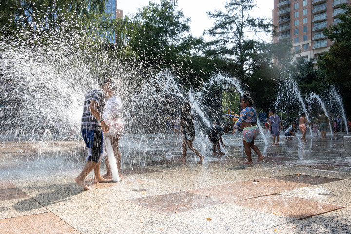 6月15日,孩子们在美国休斯敦市一处喷水公园玩耍消暑。新华社发(陈晨摄)