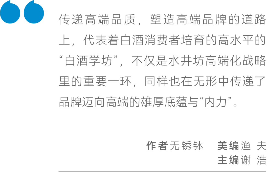 这之中,传递高端品质,塑造高端品牌的道路上,代表着白酒消费者培育的高水平的“白酒学坊”,不仅是水井坊高端化战略里的重要一环,同样也在无形中传递了品牌迈向高端的雄厚底蕴与“内力”。
