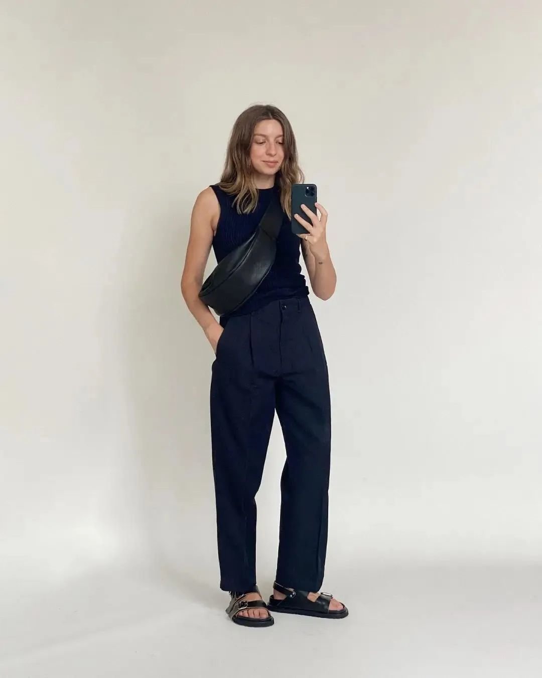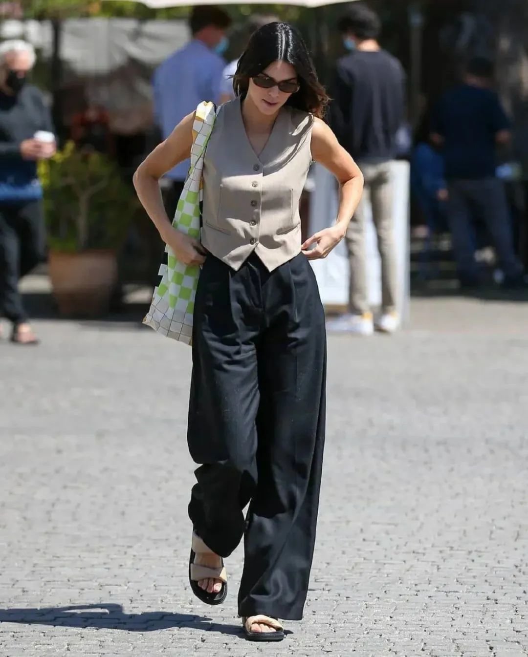 简单的马甲西装裤造型,单看可能有点严肃,搭配勃肯鞋可以松动一下整体氛围,增加随性感。