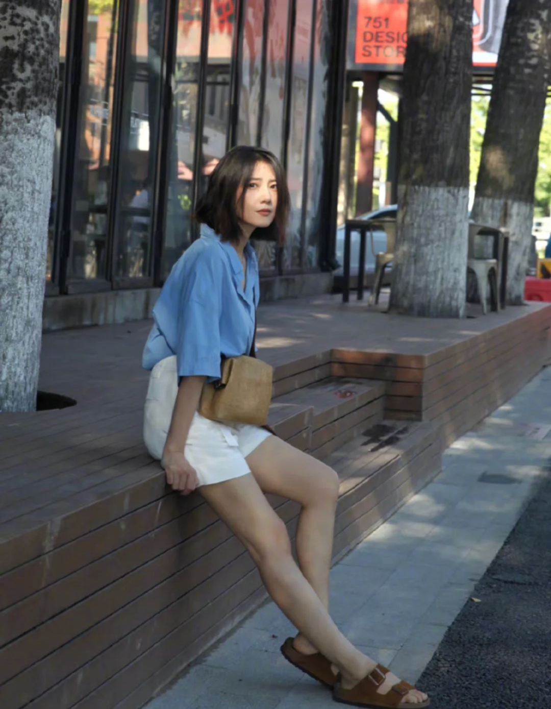 简单的蓝衬衫和白短裤,配色特别干净,搭配的勃肯鞋也很松弛,给人一种随便一穿,但是百看不腻的自在感。