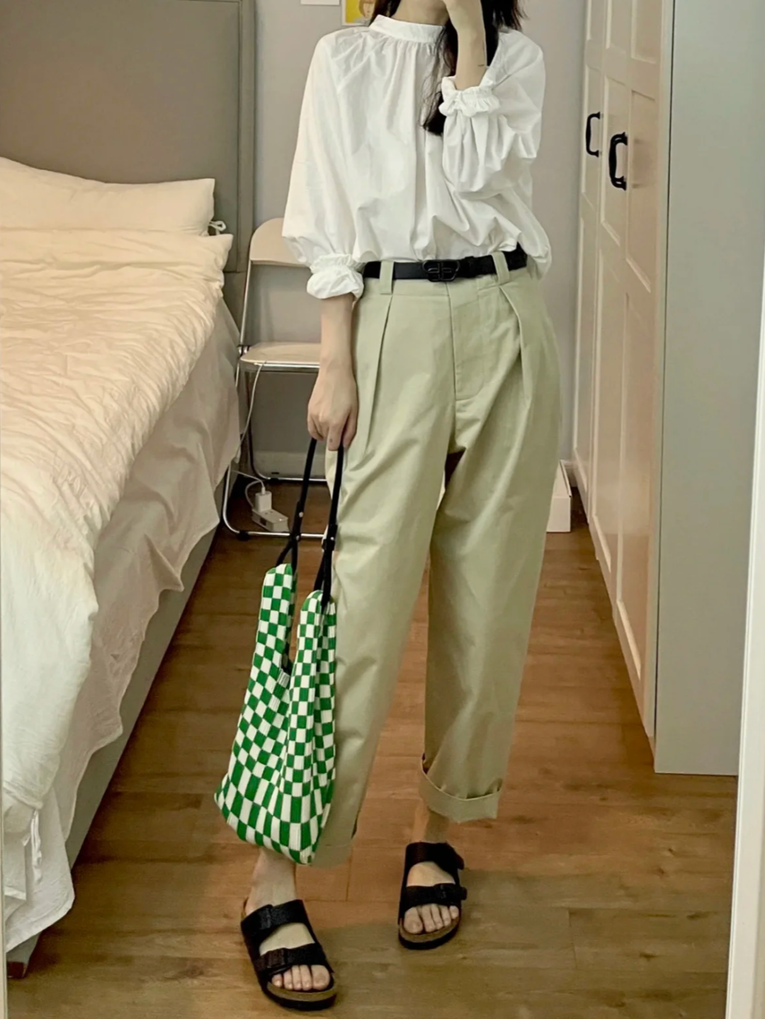 我们平时上班穿的衬衫、哈伦裤,搭配皮鞋可能会显得过于拘谨板正,换成好走的勃肯鞋就松弛很多,而且脚部还更凉快。