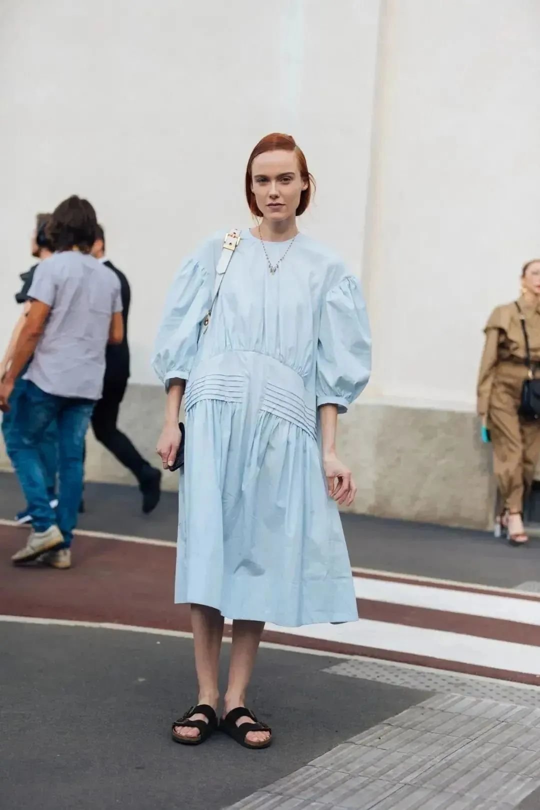 很多粉嫩的裙子搭高跟鞋或者玛丽珍容易用力过猛,换成慵懒的勃肯鞋就刚刚好。