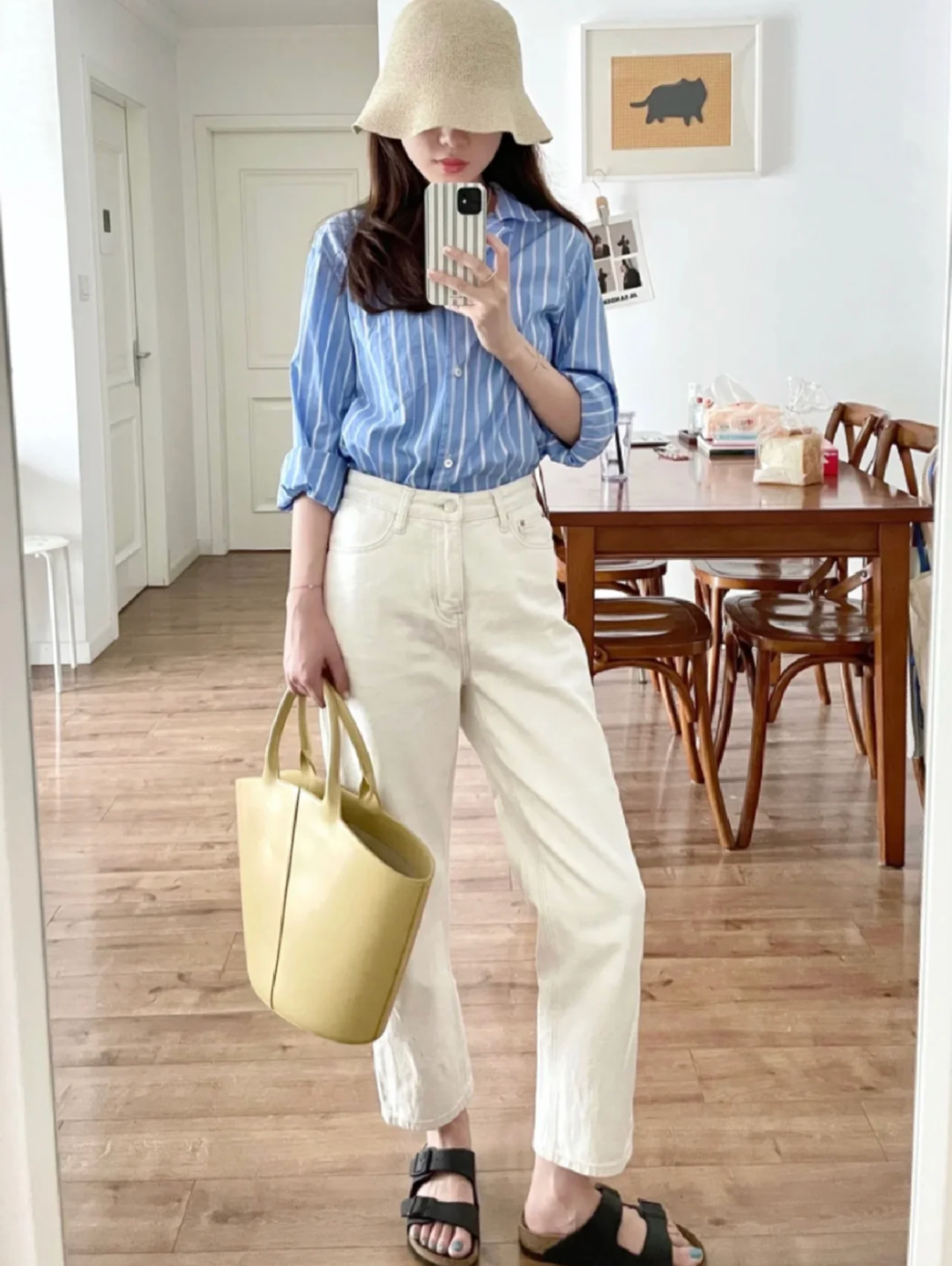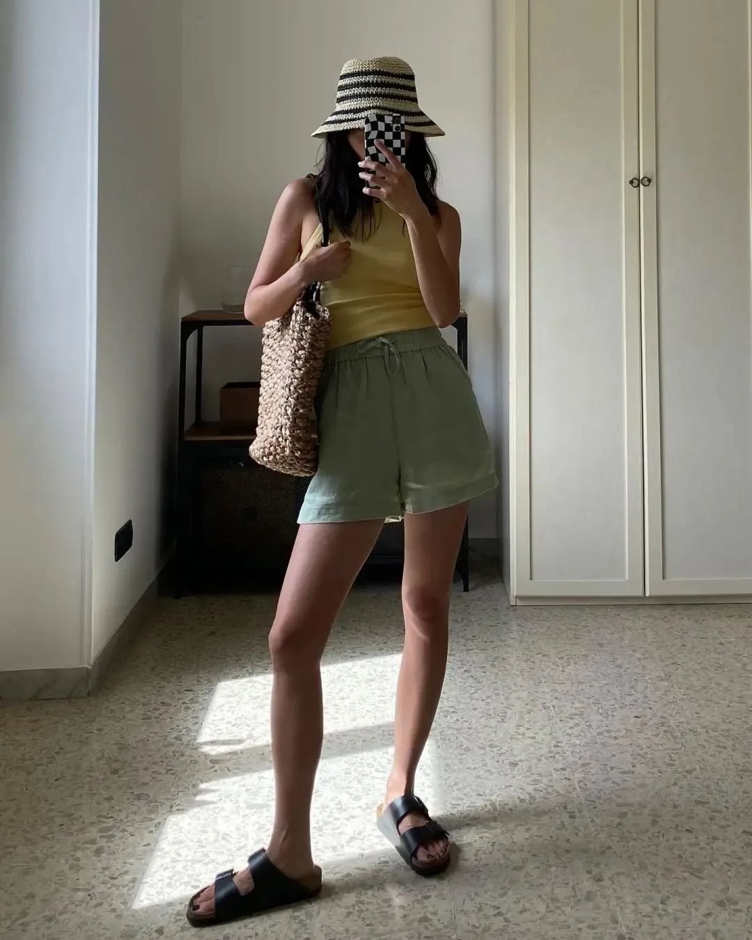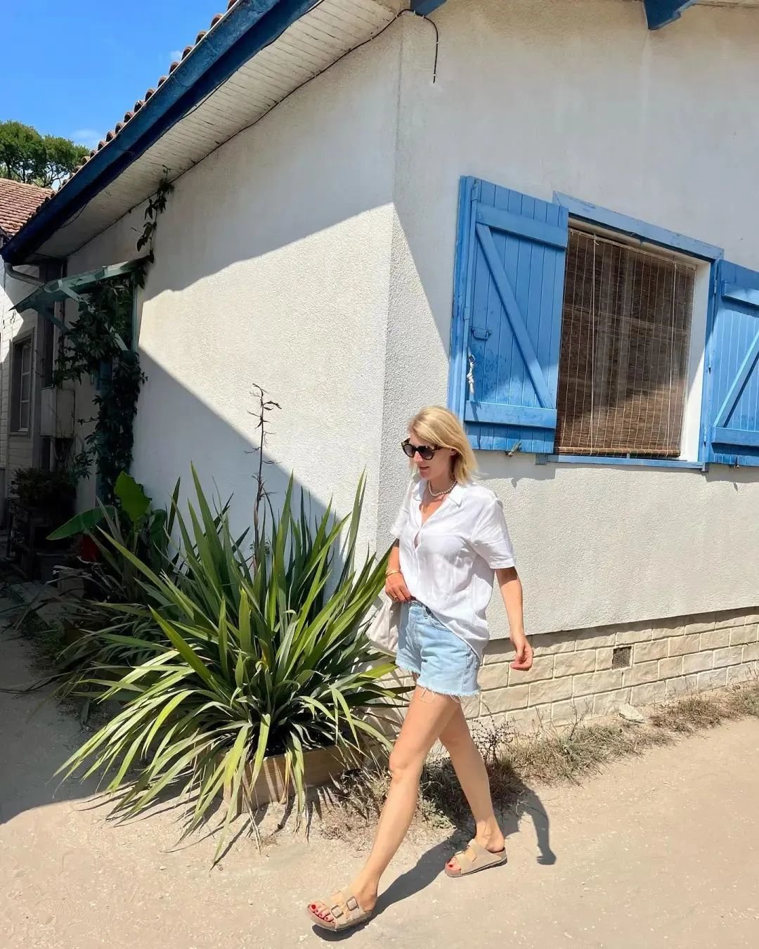 棉麻衬衫扎进牛仔短裤里,搭勃肯鞋就是妥妥的度假风,舒适好走又不会过于懒散。