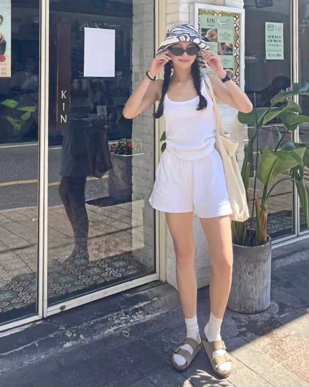 勃肯鞋配背心短裤就更自在了,在家宅着、出门遛狗、旅游观光,通通OK。