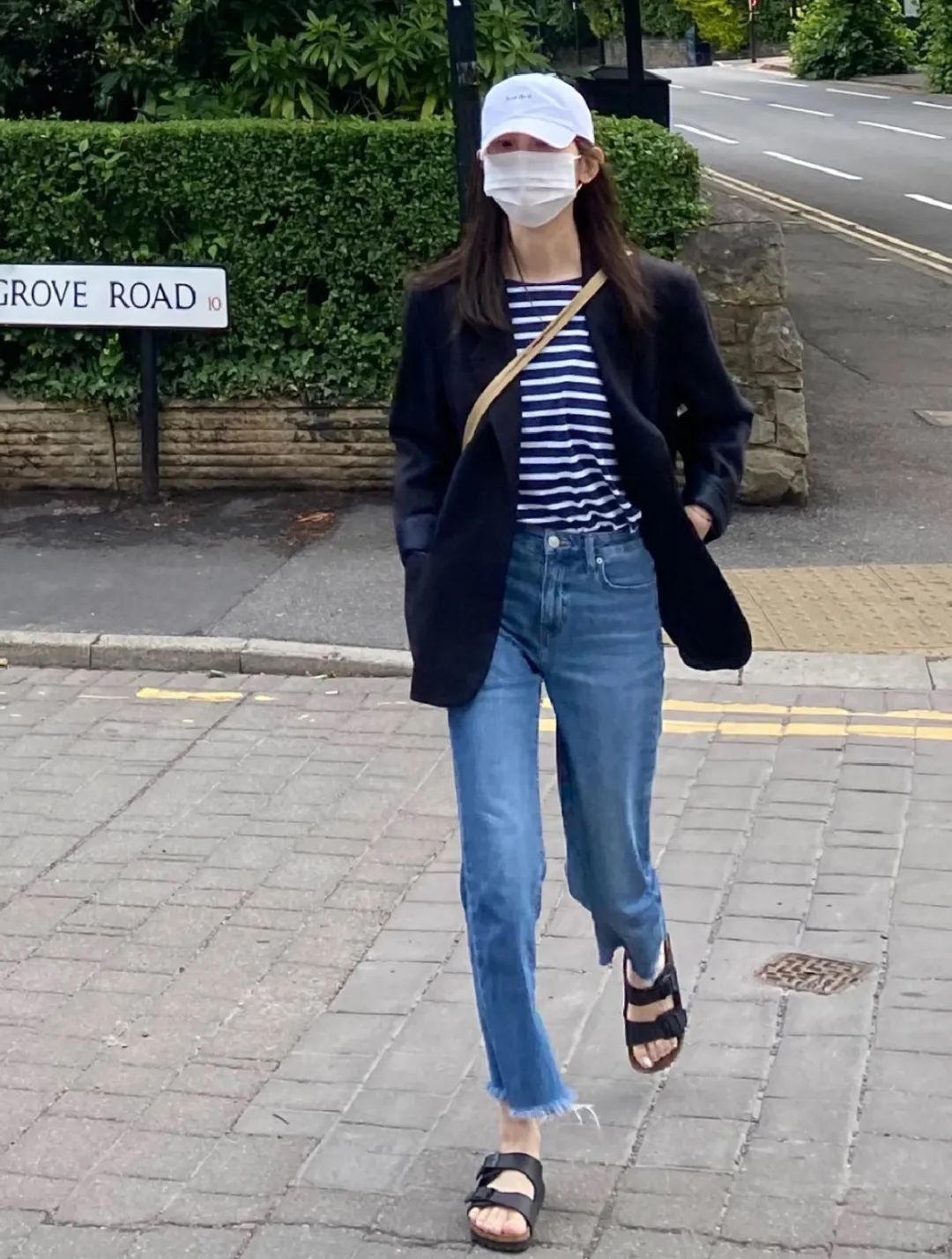 勃肯鞋跟西装、牛仔裤也很搭,上半身正式下半身休闲,整体非常平衡。