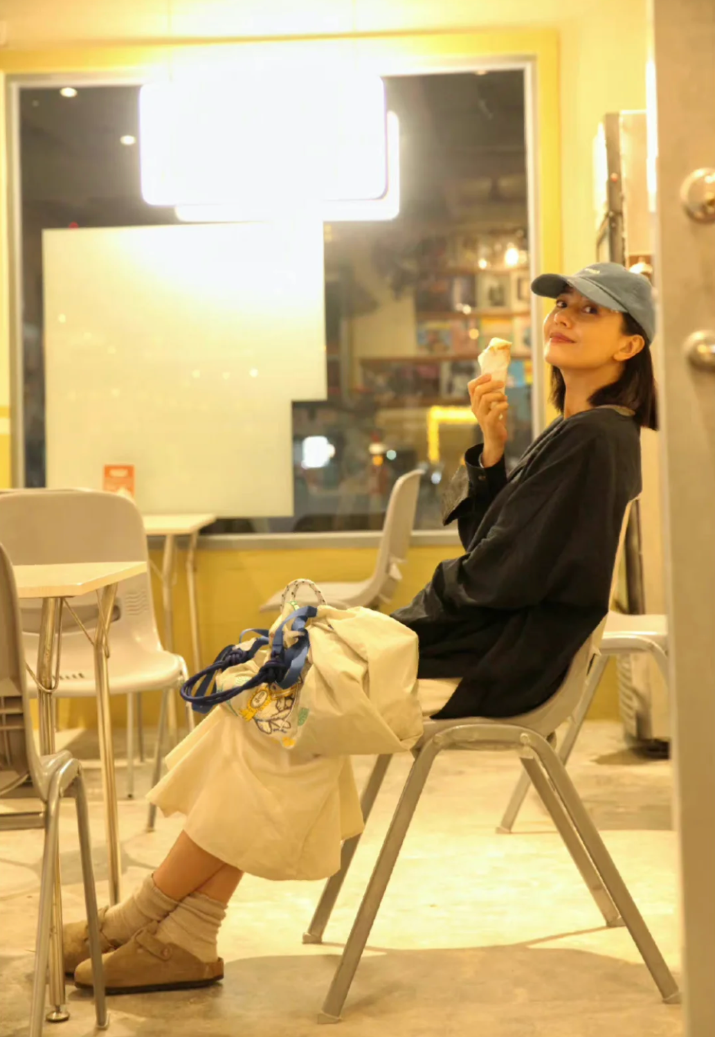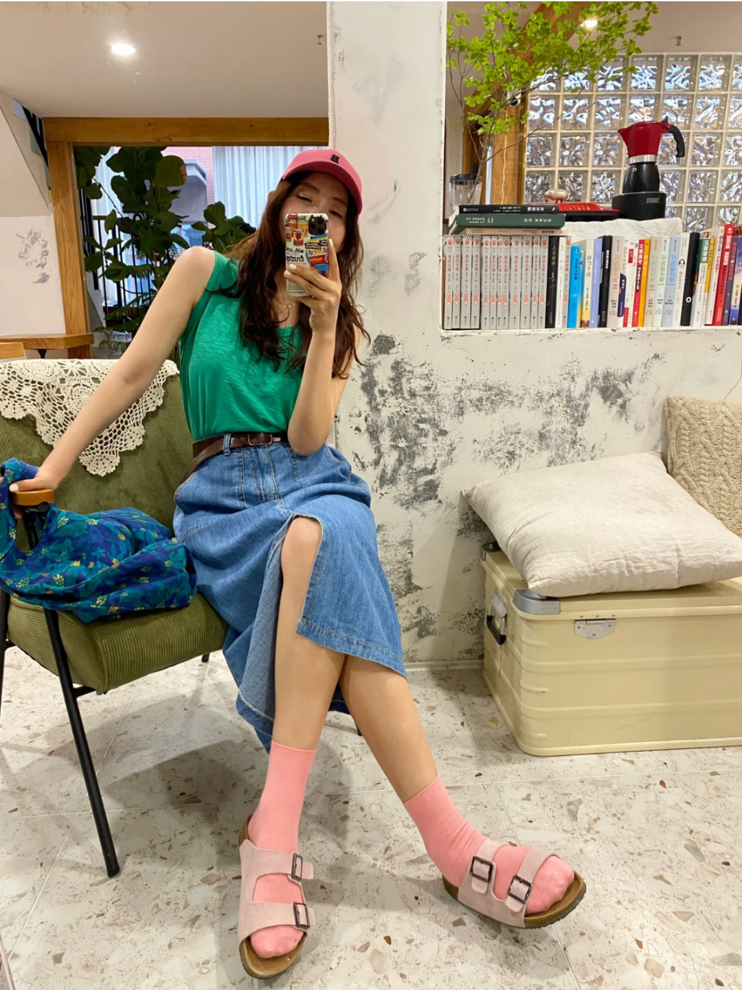 她之前这组照片也很火,选了包头勃肯鞋搭棒球帽和长裙,非常日系。