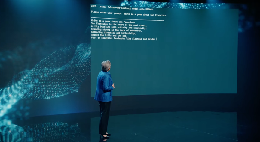 与英伟达H100芯片相比,MI300X提供的HBM密度最高是前者的2.4倍,HBM带宽最高则是1.6倍。这意味着,AMD的芯片可以运行比英伟达芯片更大的模型。苏姿丰强调,生成式AI模型可能不再需要数目那么庞大的GPU,由此可为用户节省成本。在发布会现场,她还用Hugging Face基于MI300X的大模型,实时写作了一首关于举办地旧金山的诗歌。