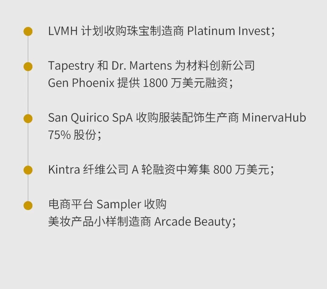 除了以 LVMH 集团、OTB 集团、Burberry 为例的国际奢侈集团或品牌外,过去几个月以来,面向供应链企业的投资者,也不乏电商平台 Sampler、数字体育平台 Fanatics 等等,尽管面向供应链企业的投资收益期无疑是漫长的,但随之而来更强大的产品与价值竞争壁垒、更强的稳定性与话语权…..在当下经济环境与复杂的产业结构中,或许更能见证下一个“巨头”的诞生。