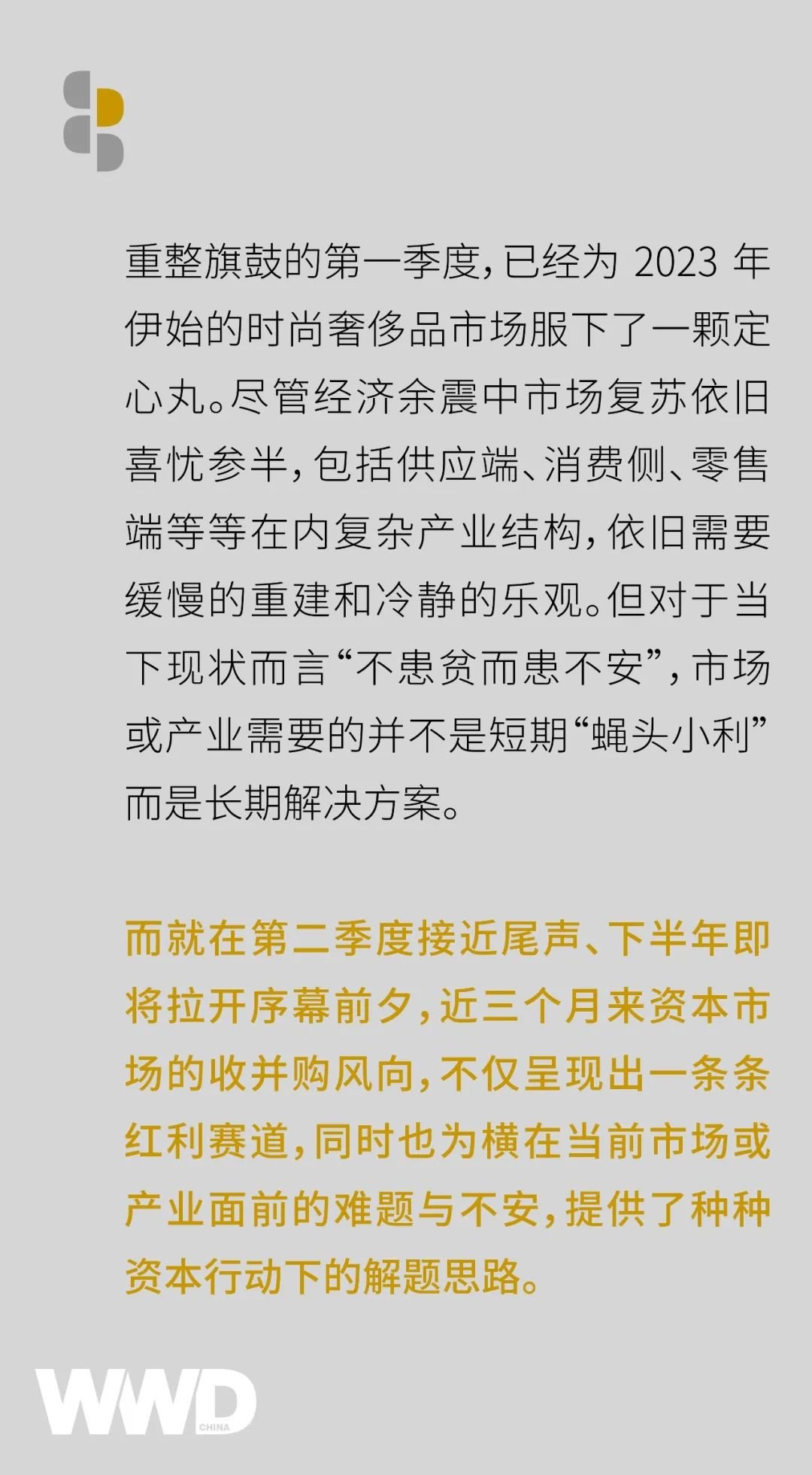 或通过投并购、分销许可协议等模式复兴传统品牌,或抄底深陷泥泞的经典品牌,或抛售旗下品牌….在 2023 年第二季度的投并购风向的种种取舍行动中,也呈现出一股核心优势补给的资本动作——对自身资本结构、对资本价值更为精准的梳理与审视,而非大刀阔斧的开疆扩土或固步自封。