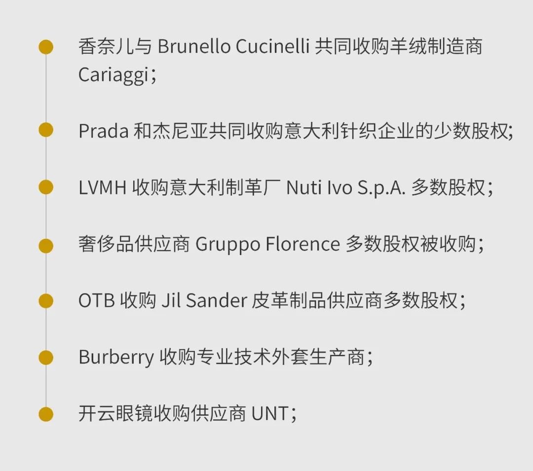 过去很长时间以来,一直不乏拥有更高市场占有率和话语权的国际奢侈品牌,不断透露出对供应链并购的热情,这一趋势在过去的第二季度更加显著,并涌现出更加多元的投资者。由此不难看出,从市场投资策略到产业投资逻辑。未来,时尚奢侈品领域的“强者恒强”资本思维,将不仅仅被呈现为品牌、产品矩阵、收益能力的强大程度,而是市场逻辑更深处,纵向一体化的资本行动。