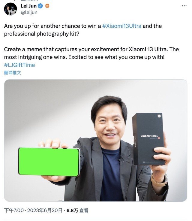 雷军称:“您是否还有机会赢得 Xiaomi13Ultra 和专业摄影套件?创建一个 meme,捕捉您对小米 13 至尊纪念版的兴奋之情。最有趣的获胜。很高兴看到你想出什么!”