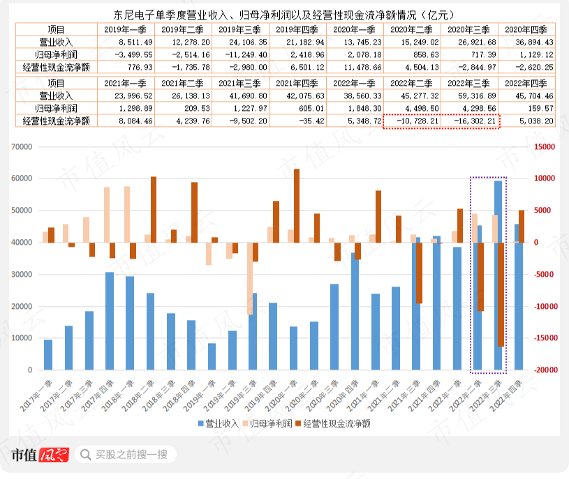 从单季度数据看,东尼电子在2022年二、三季度账面归母净利润虽然较高,但经营现金流净额大幅流出,显然,该公司赚了个寂寞。
