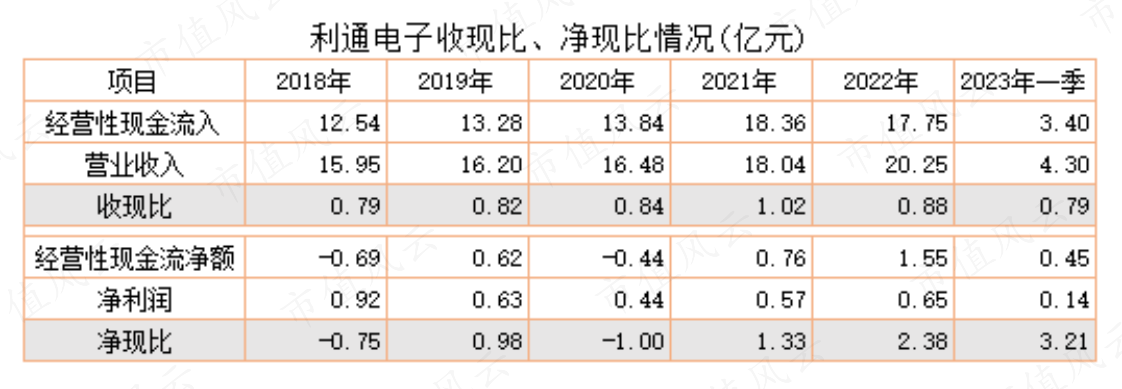 东尼电子收现比正常,该数值在1上下,而净现比变动非常大,2022年经营性现金流净额-1.66亿元,当期虽然有1.06亿元的净利润,但实际并没有真金白银流回上市公司的口袋,赚了个寂寞。