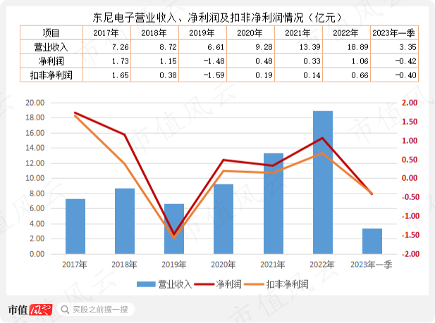东尼电子自2017年上市上市以来,业绩波动很大,2018年扣非净利润0.38亿元,而2019年则亏损近1.6亿元,2022年0.66亿元的扣非净利润,但今年一季度就亏损了近4千万元。