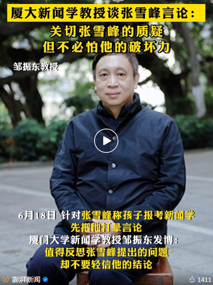 厦门大学教授邹振东随后跟团,强烈反驳张雪峰。