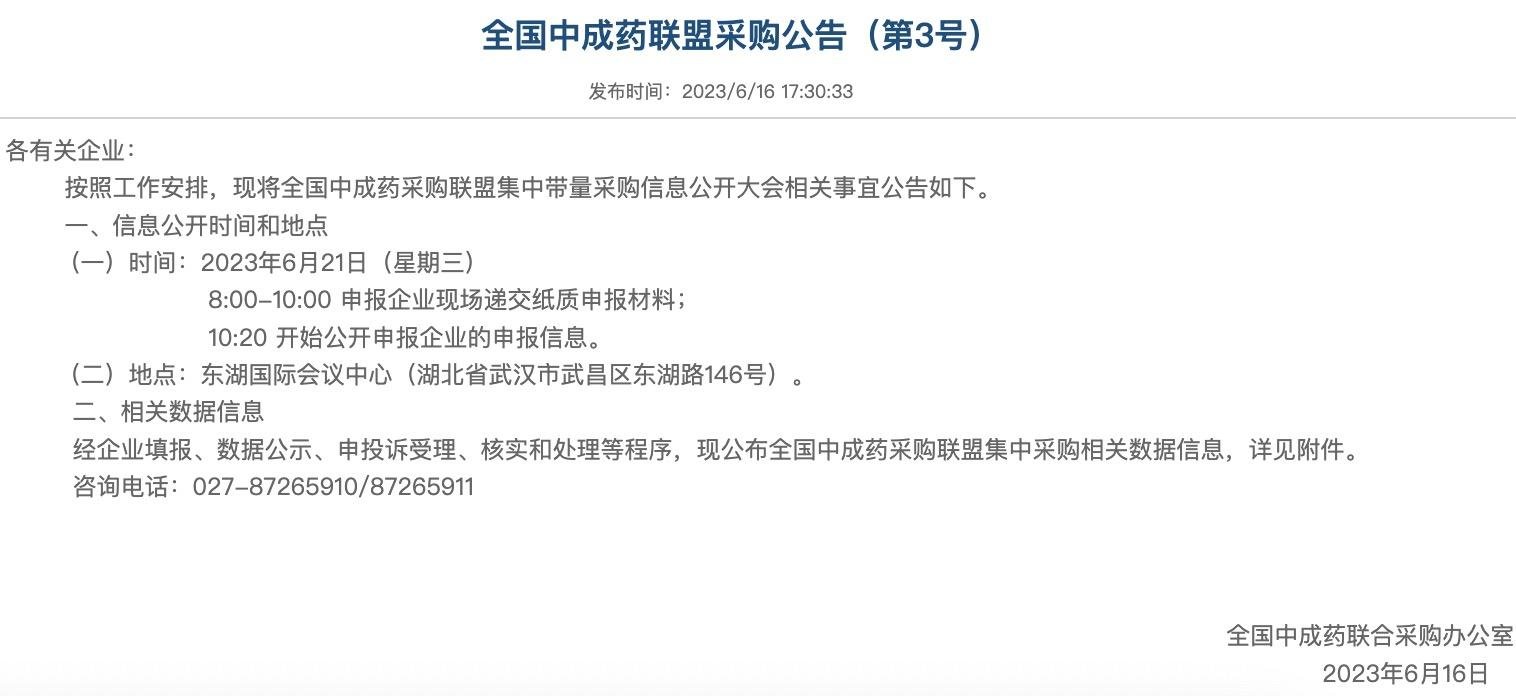 红星资本局6月21日消息,根据全国中成药联合采购办公室发布的《全国中成药联盟采购公告(第3号)》,全国中成药集采于今日在武汉东湖国际会议中心开标。