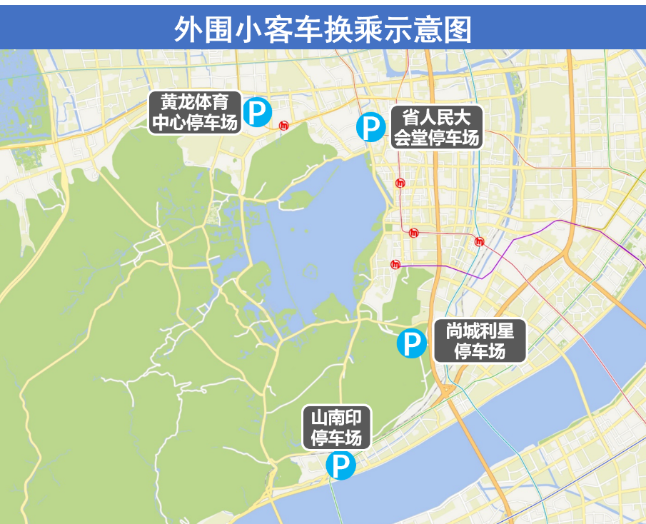 端午期间每日8时至18时,在黄龙体育中心停车场、省人民大会堂停车场、尚城利星停车场、山南印停车场等4处停车场实施小客车与公交车换乘。