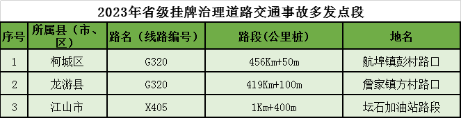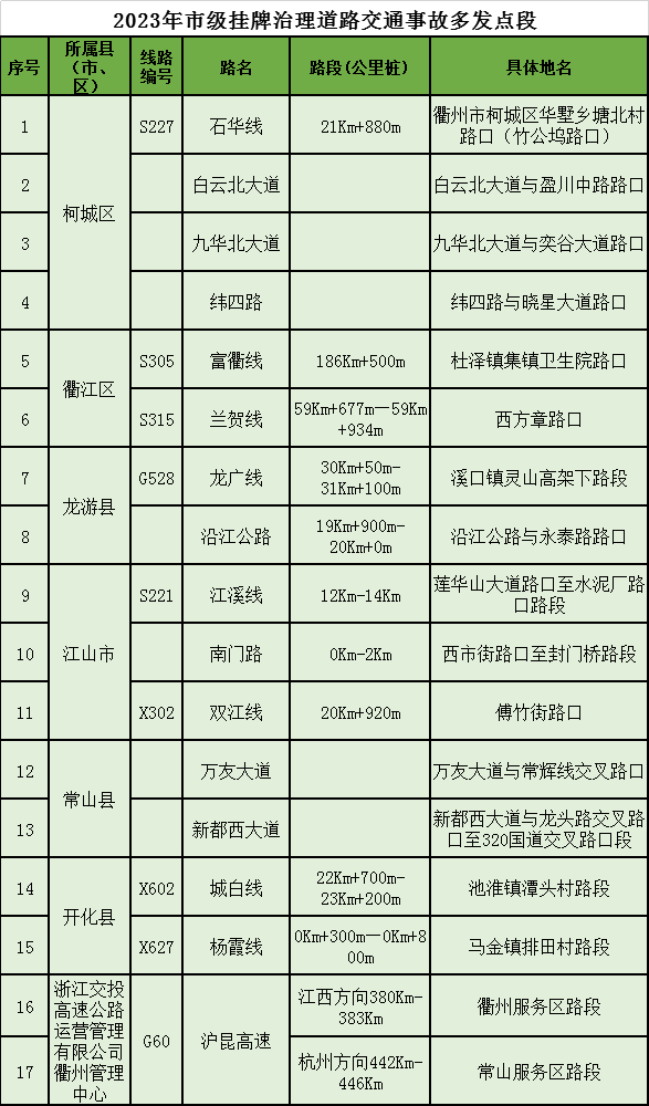 江山市:205国道(凤林镇至峡口镇)路段、315省道(衢州交界至牛头岭)路段、315省道(碗窑乡凤凰村路口至清湖街道华夏村)路段、墩贺线(水泥厂路口至红火集团)路段、墩贺线(贺村镇天一宾馆至丰益村)路段、315省道源口路口、205国道(贺村五号桥至市上村)路段、221省道莲华山大道与老水张线路口、221省道(水泥厂路口至江山底村)路段、205国道(鳌头至坛石立交)路段、花峡线(石门镇至江郎山风景区)路段、双江线(七一村至四都镇)路段。