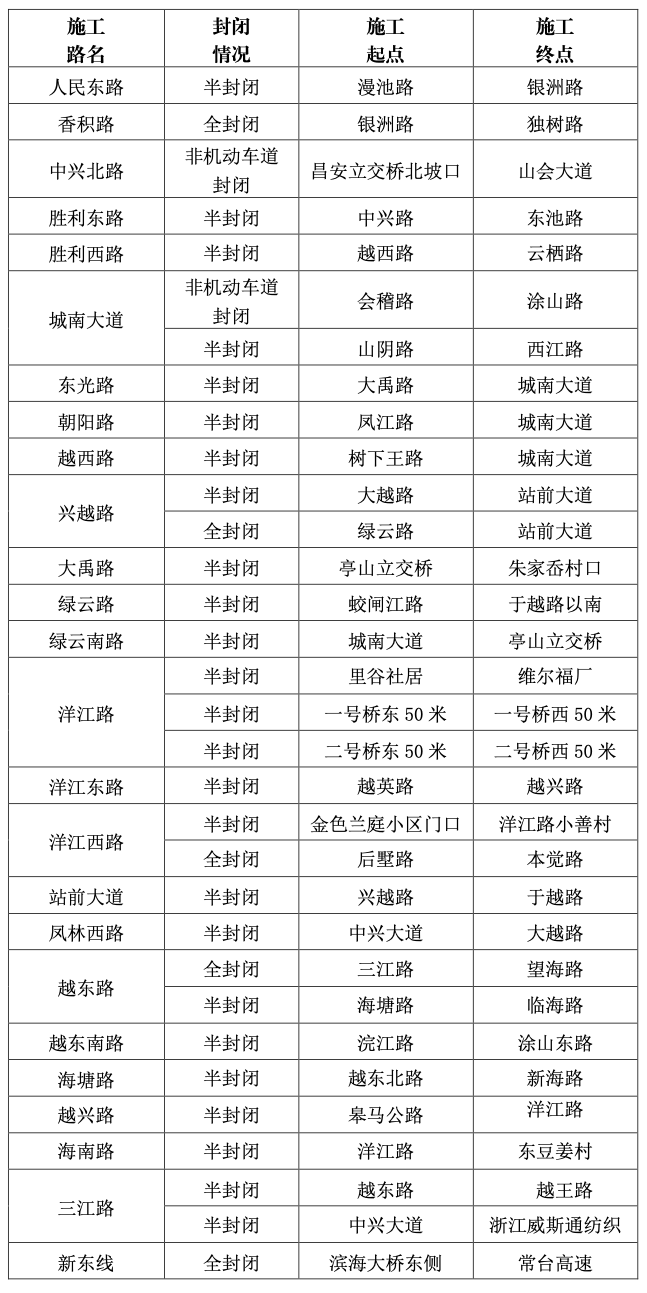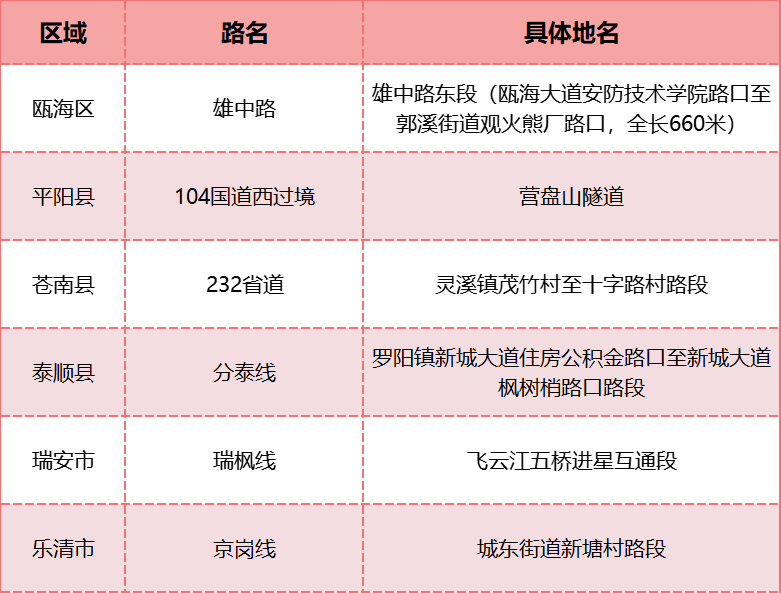 温岭市:九龙湖公园、锦屏公园周边、银泰城、新天地、宝龙广场、锦江百货等商业圈周边、岙底胡村岙底胡路、中心大道、上箬路全线(道路施工)、坑洋村、林岙村。