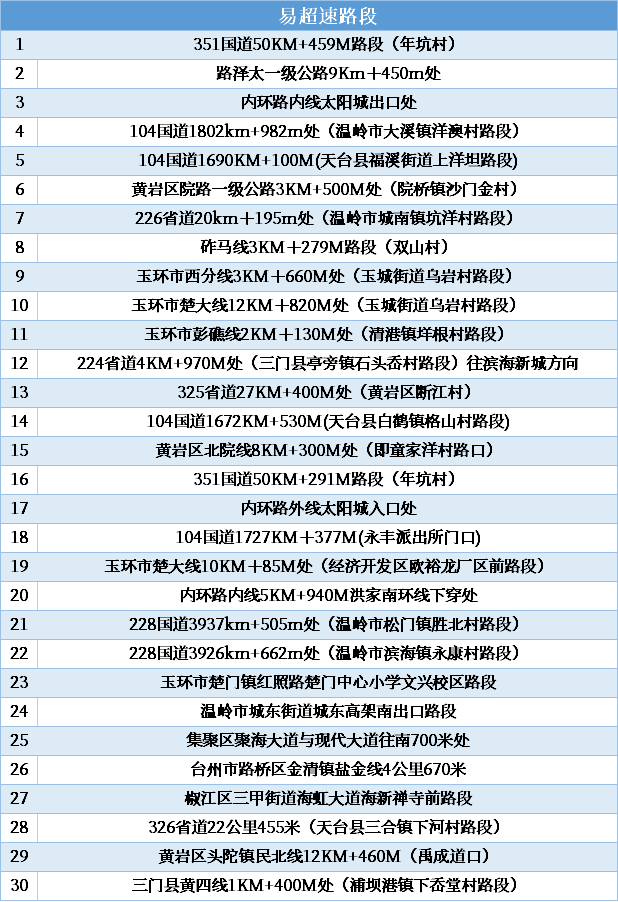 临海市:钱暄路、后岭垮、揽胜门、崇和门、泉井洋路至赤城路、靖江北路至后山、江滨路朝天门至灵江一桥路段、大钓线邵家渡前湾村路段、灵湖周边路段、星悦城周边、临海北高速路口、奋进街、括苍镇小车线、小杜线城里路段、桃渚四岔车站前、104国道351国道交界留贤红绿灯、临海西高速路口、河头大桥路段、沿江镇104国道下洋水红绿灯路口、沿江镇104国道府前街口、沿江镇马上线下湾桥头路段、沿江镇临海南高速路口、白沙湾公园周边、351国道头门港大桥路段、南屏路口、小杜线、盈杜线、225省道白石路段、351国道溪头线、环城北路、括苍山山门处及山顶、马横溪桥头。