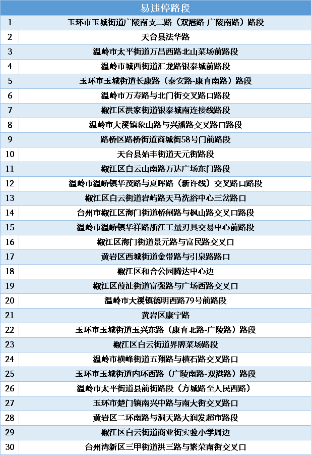 路桥区:文昌路、迎宾大道机场到应家路段、路泽太到吉利大道路段、南街到肖岙岭山洞路段、中盛百货周边、富士路与银座街、财富大道(商业城、恩泽医院路段)、文化路中央山公园二期、三期路段、桐方线、蓬街私立中学前路段、金林路路段、人民路路段、樱花路儿童公园路段、内环南路辅道亲水平台路段、湖滨路、黄礁岛、新大街、南洋公路与机新路交叉路口。