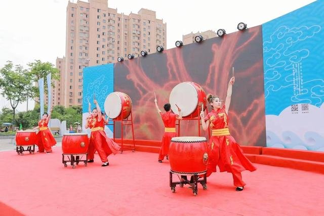 在周浦镇周欣社区中心的姚雨港,河道边鼓声震天,舞龙舞狮上下翻飞;河面上12支社区参赛队正在逐浪奋进,争夺冠亚军的龙舟赛正在进入高潮。