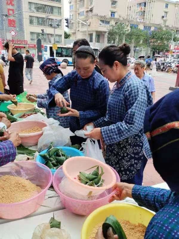 一拨又一拨游客纷纷来到包粽摊前。只见步行街两边的长桌上分别摆放着一叠叠青绿绿的刚从清清小河边采摘来的芦叶,一股股浓浓的清香味扑面而来;摊位上的新鲜菖蒲青翠欲滴,暗绿色的艾草闪着盈盈的光汁;十多位乡村老妈妈着一色青蓝色的土布服饰,腰系自制的香袋,在摊位前包着各式乡土粽;展台上展示着刚包好的三角粽、桑蚕粽、扎粽、、小脚粽、迷你粽等品种……许多游客光看觉得还不过硬,忍不住上前,饶有兴趣地跟老妈妈学着包粽子。
