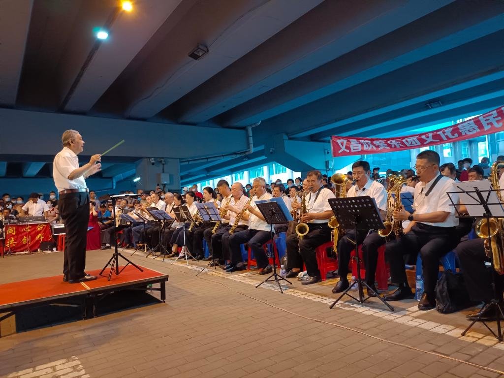 “首先介绍一下今天的指挥,王辉老师……下面请欣赏吹奏乐《山楂树》。”身着旗袍的主持人刘丽华缓步下台,随着指挥快速挥动手臂,桥下被悠扬的音乐声环绕,乐手们配合默契,观众也会跟着哼唱。乐曲奏毕,掌声雷动。