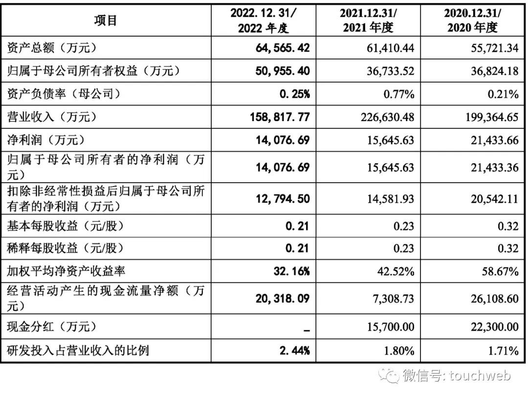 招股书显示,三态股份2020年、2021年、2022年营收分别为19.93亿元、22.66亿元、15.88亿元;净利分别为2.14亿元、1.56亿元、1.4亿元;扣非后净利分别为2.05亿元、1.46亿元、1.28亿元。