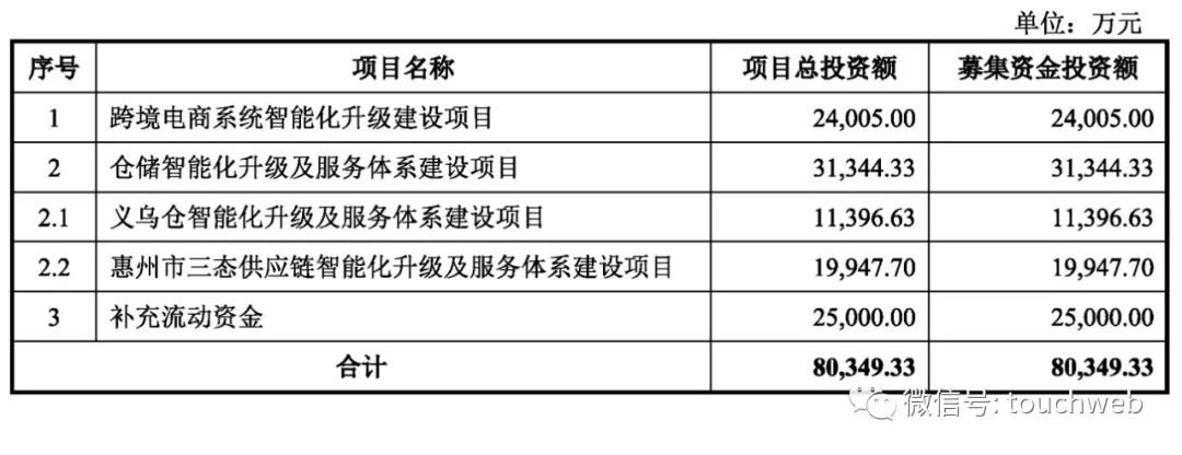 三态股份计划募资8.03亿元,其中,2.4亿元用于跨境电商系统智能化升级建设项目,3.13亿元用于仓储智能化及服务体系建设项目,1.14亿元用于义乌仓智能化升级及服务体系建设项目,2亿元用于惠州市三态供应链智能化升级及服务体系建设项目,2.5亿元用于补充流动资金。