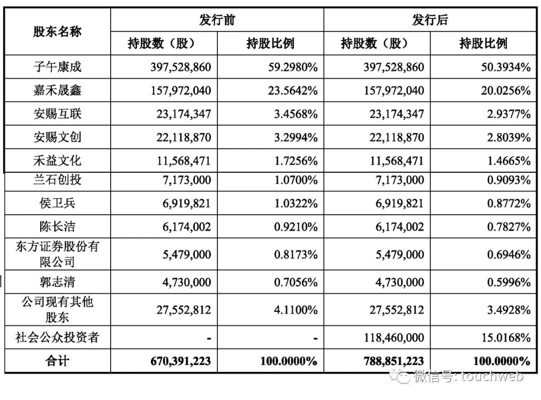 IPO后,子午康成持股为50.3934%,嘉禾晟鑫持股为20.0256%,安赐互联持股为2.9377%,安赐文创持股为2.8039%,兰石创投持股为1.4665%,兰石创投持股为0.9093%,侯卫兵持股为0.8772%,陈长洁持股为0.7827%,东方证券股份有限公司持股为0.6946%。