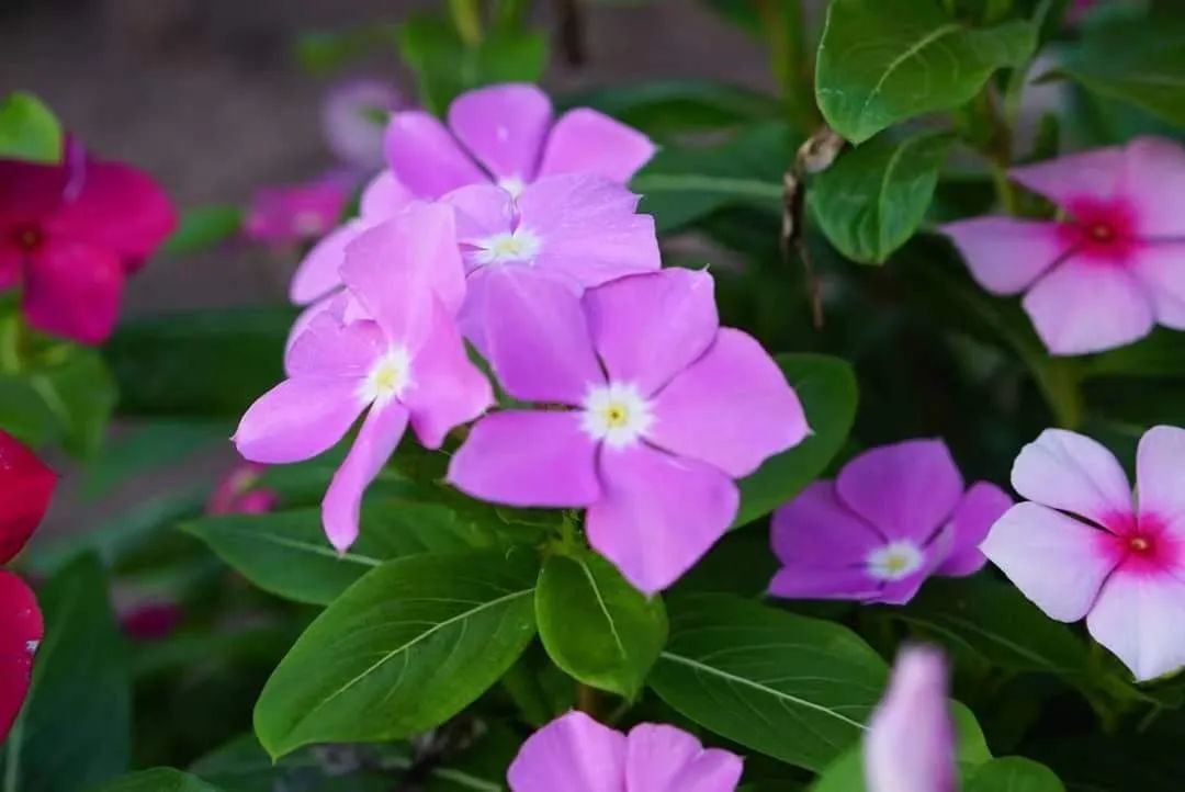 长春花有一些好看的花色,夏天养这种植物可以暴晒,可以淋雨,但是盆栽养护的时候,一定不要让它缺水,雨水季节不要胡乱修剪。