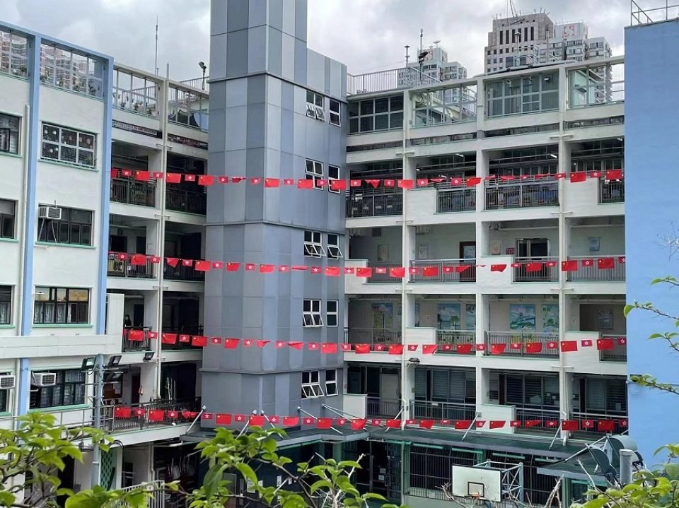 电车、巴士、天桥、学校等,都挂上庆祝回归海布
