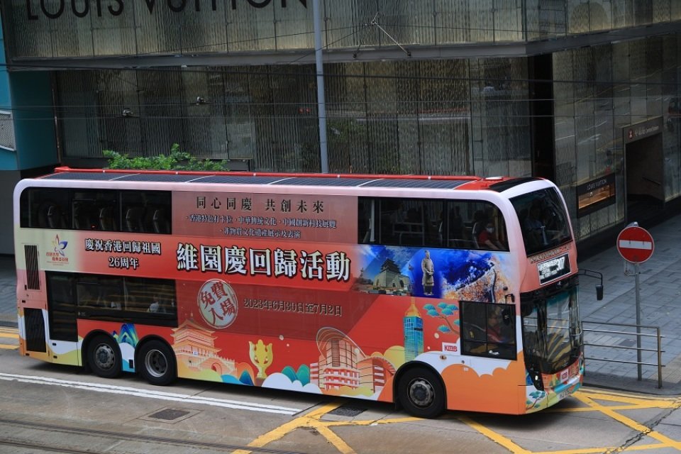 其中,在铜锣湾崇光百货外墙大电视上,不时会出现“维园庆回归,香港特色艺术打卡热点”,十分醒目。电车、巴士、天桥、学校等,都挂上庆祝回归海布,并写上“请您5天免费搭叮叮”、“庆祝香港特别行政区成立二十六周年”、“热列庆祝香港回归祖国26周年”等等。