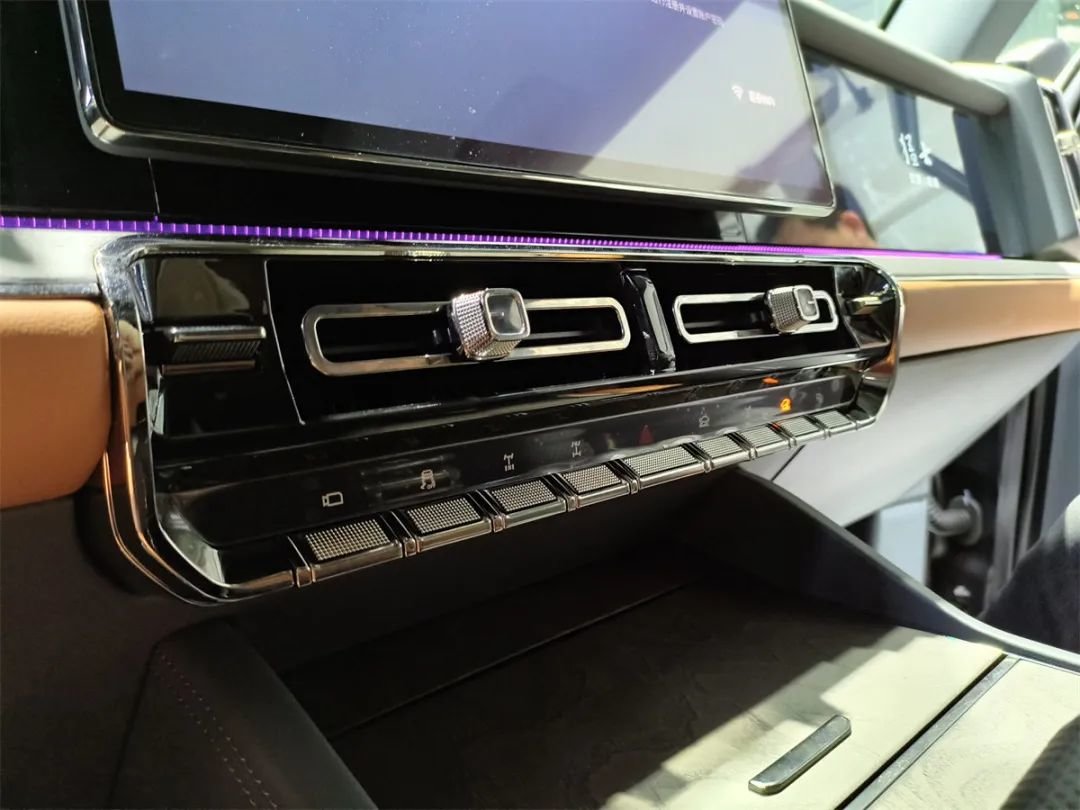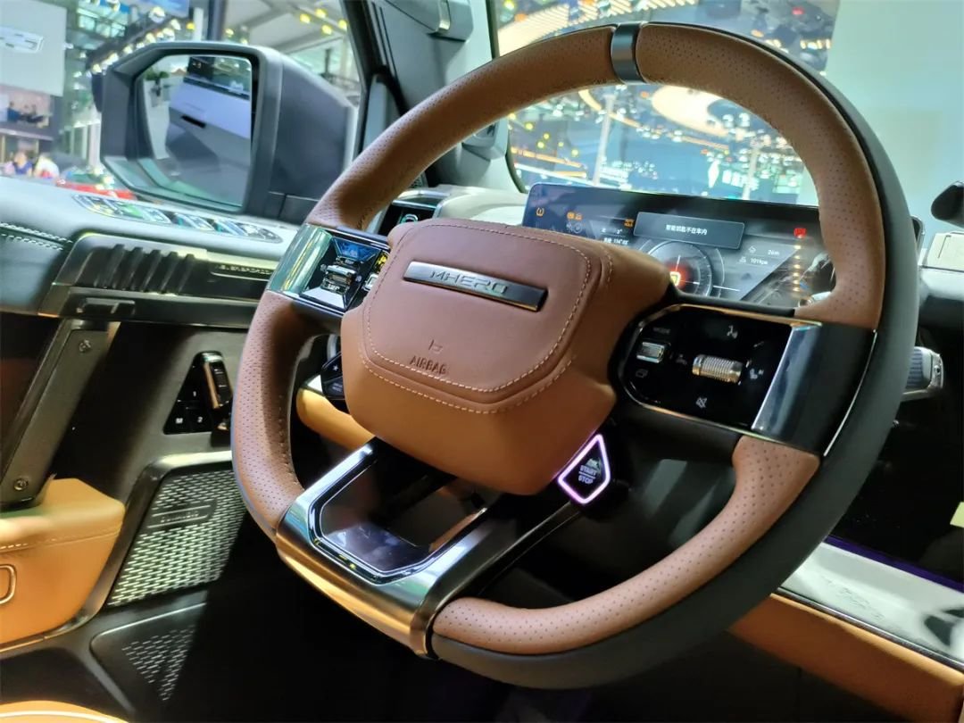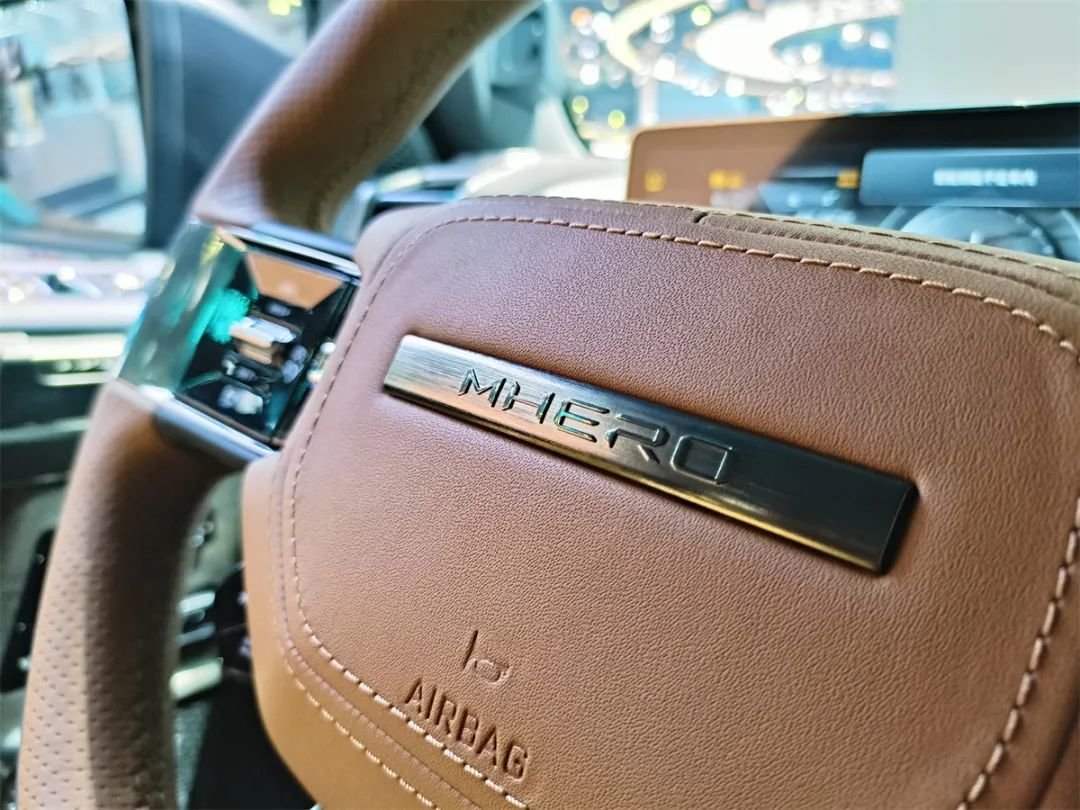 虽然是一台定位为硬派越野的车,但猛士917同样不缺少细节。首先是方向盘,猛士的LOGO用冲压的方式刻在一块不锈钢片上,再镶嵌进大面积真皮的方向盘内圈里。通过我们这张细节图大家同样可以发现,猛士917这个方向盘的真皮包裹物,用的是头层牛皮,而非很多百万级车型普遍采用的二层皮,荔枝皮甚至是覆膜皮。头层牛皮的质感,是“吊打”其他任何一种皮料的。