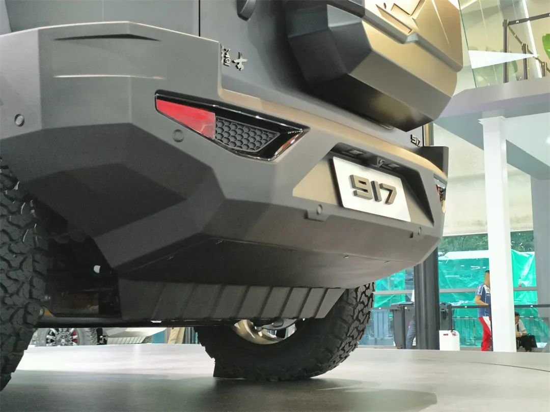 猛士917的后保险杠也很值得一说,就像这张特地仰拍的图所见,你看不到包括排气管在内的任何东西,一块后防护板直接从后半轴位置往后延伸,你所能看到的位置全都是造型非常平直的,铁灰色的金属结构。这个是很典型的,专门为越野设计的元素。在那些极端越野工况下,后保险杠需要经常和大石头之类的硬物“硬碰硬”。在这个区域如果有任何装饰物,都很可能在越野中被撞断撞烂。同理,这块的设计如果还是棱角分明的,一次高强度越野之后,这个位置就会直接“破相”。所以猛士917后保险杠这个和车头完全不同,几乎是平面构成的设计,实用性其实非常强,看得出是专门为越野设计的。