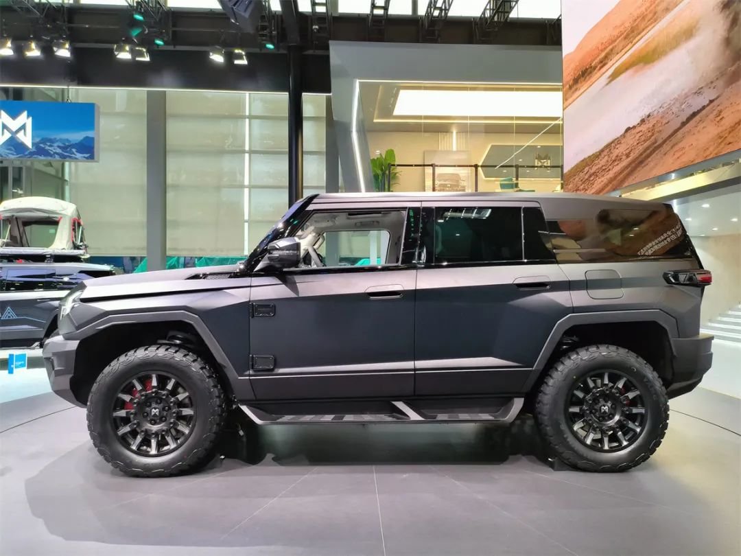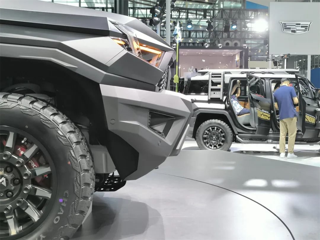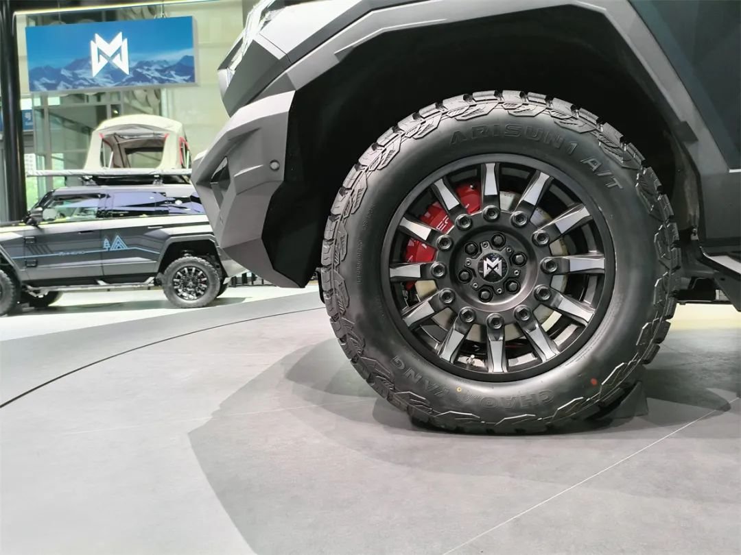 正如图中所示,这车的外观设计非常夸张,大量的棱角和折线、高得惊人的接近角和离去角,还有一看就很高的离地间隙,这一系列设计风格都不由得让人想起了军版三代猛士。但相比起军车那特殊的底盘结构,猛士917的底盘,在某种程度上,也可以代表目前我国新能源越野车的最高水准之一。
