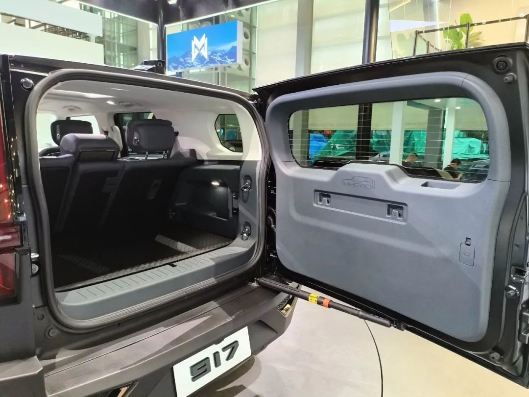 车侧的设计和车头造型呼应,非常硬核。而我们的另一个关注点在车尾。猛士917的车尾有三个值得仔细分析的点:尾门的开门方式、尾门的“背包”,以及后保险杠的造型。首先是尾门,和大多数SUV采用上掀式尾门,或者部分SUV的两段式上掀尾门不同的是,猛士917的尾门是侧开门设计。