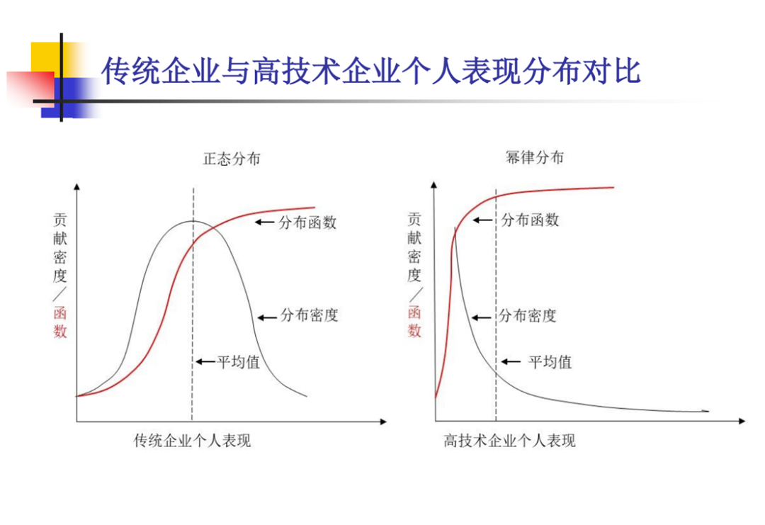 如上图。传统企业中,创造价值的主体是中间部分。比如说工厂,比如制造企业,也包括了流水线上的工人。但是,高技术企业创造价值最突出的部分,或者说做出了最突出贡献的部分,实际上只占人力资源中很小的比例,而这个比例是服从于幂律分布的。