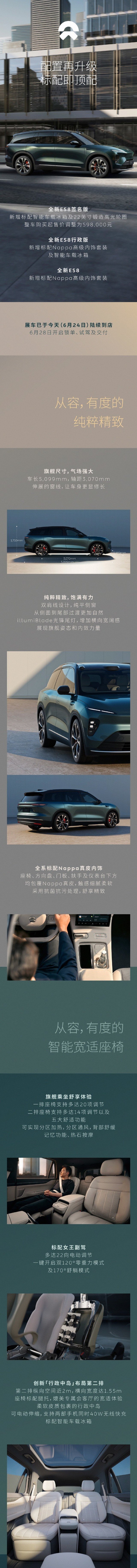 蔚来汽车宣布全新 ES8 车型配置再次升级,新增智能车载冰箱及 22 英寸锻造高光轮圈,全新 ES8 签名版车型起售价为 59.8 万元(下调 1 万元),6 月 28 日将开始锁单、试驾和交付,下订可享 5000 元抵 10000 元限时预定权益。