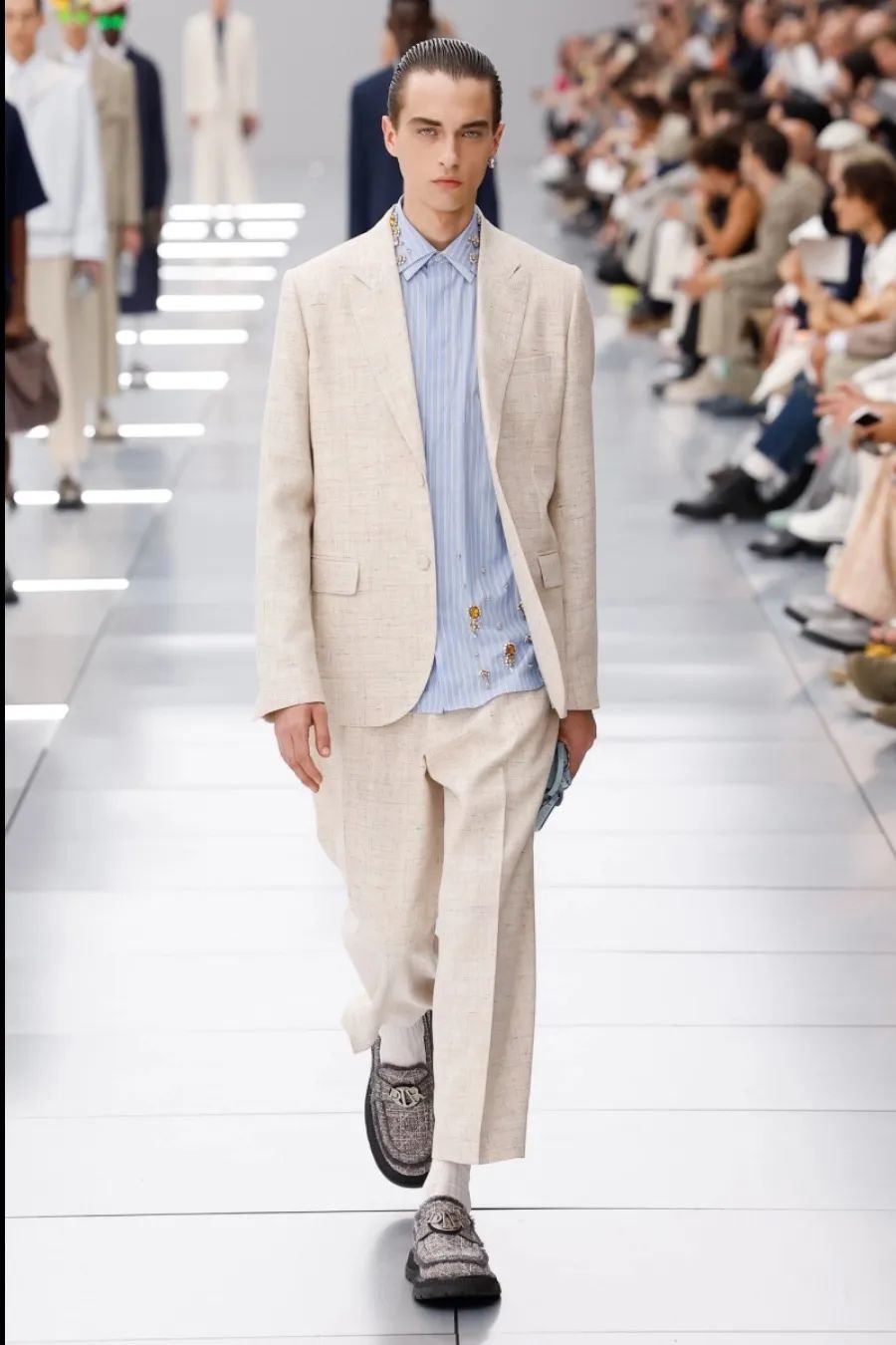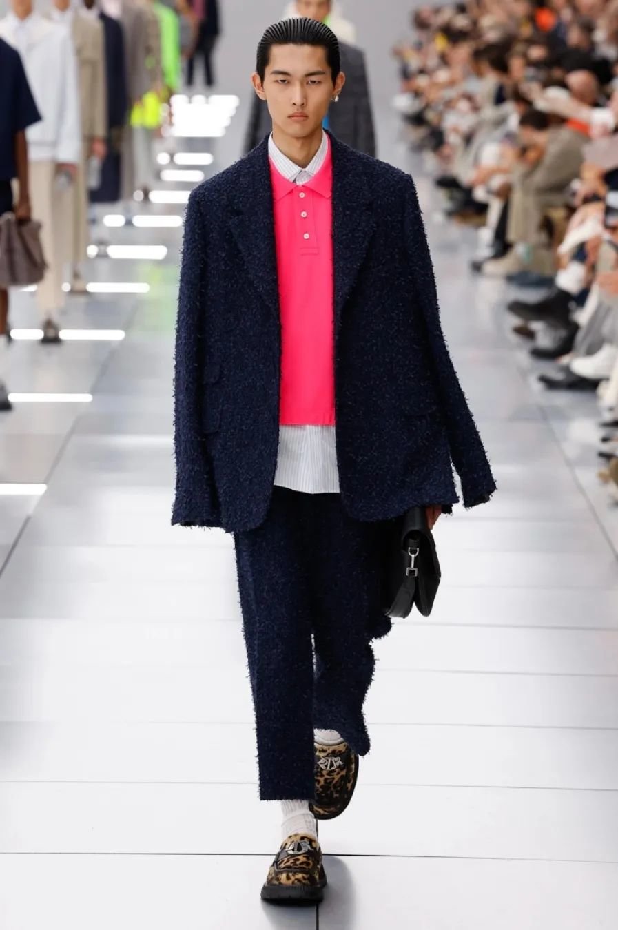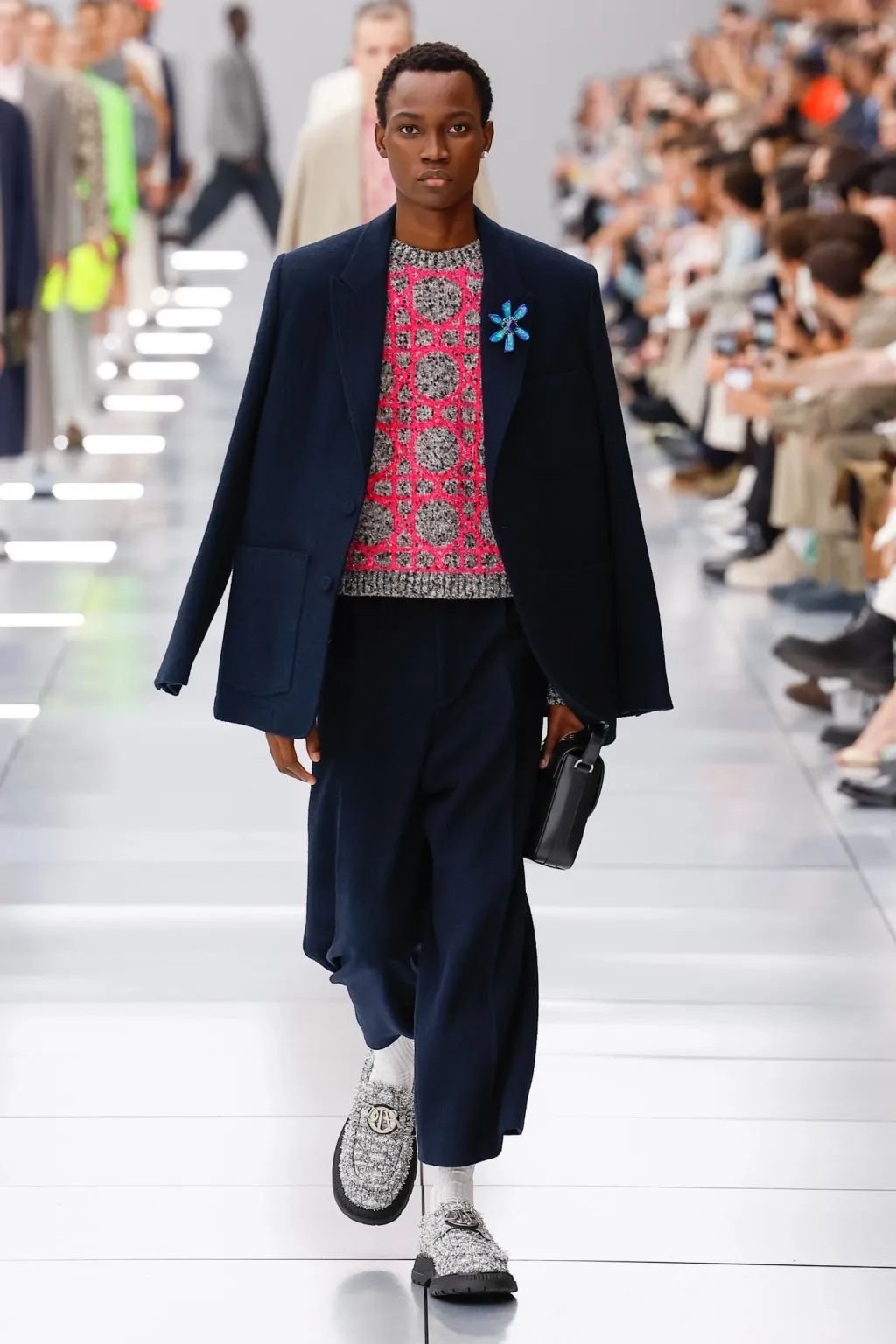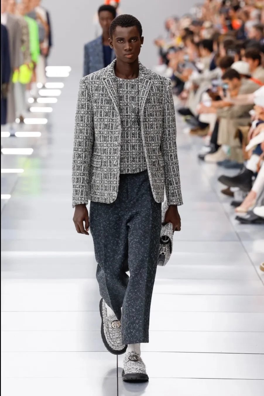 他在迪奥任职五年,为了庆祝这个里程碑,2024 春夏系列向品牌的高级订制传统致敬。以克里斯汀·迪奥(Christian Dior)与他的继任者们为灵感,继承了女装文化并应用于当代男装。荧光色和贯穿发布会的 Cannage 花篮纹成为亮点。