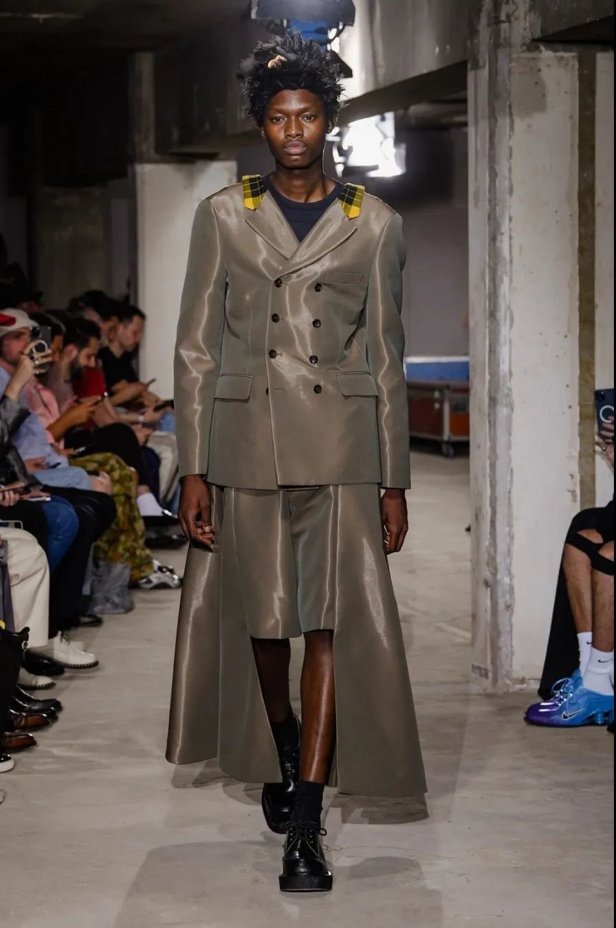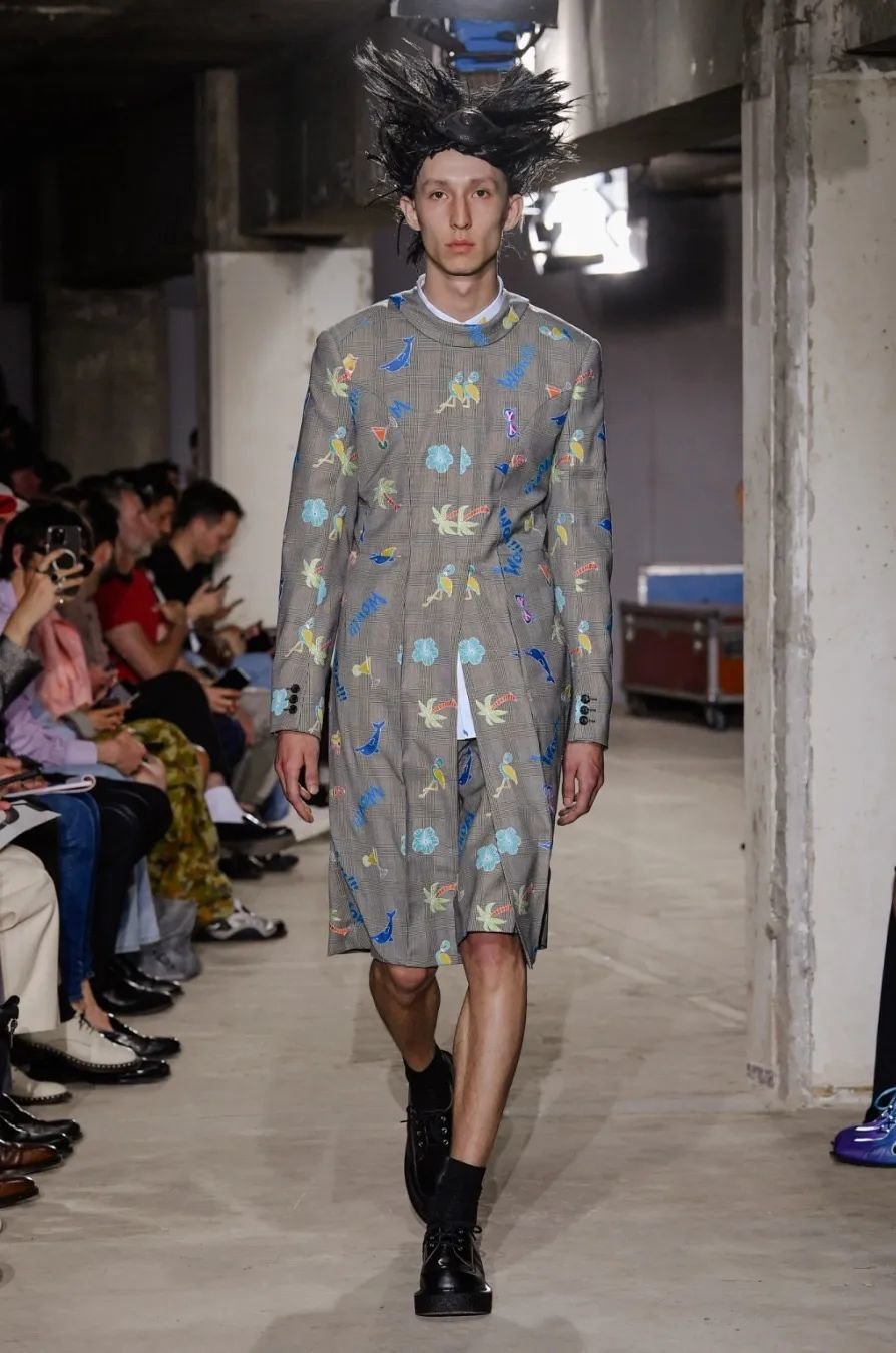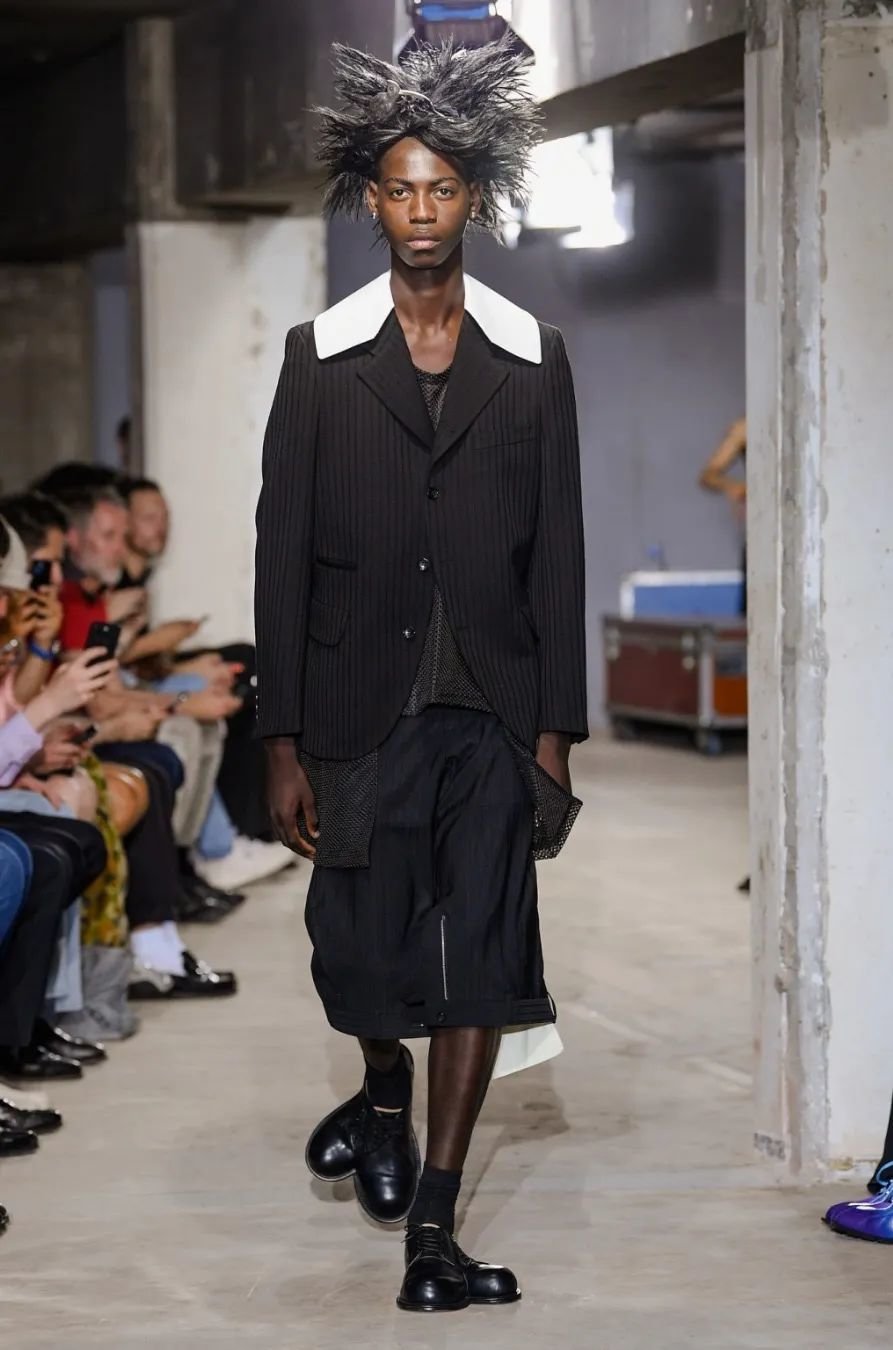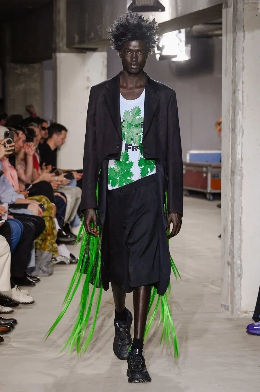 日本设计师川久保玲(Rei Kawakubo)展示了一场前卫的男装秀。她以窗帘为灵感,将西装后背分割并用系带收紧。她大胆尝试了颠覆性的设计,如倒挂的袖子、拼接的夹克和裤脚上翻。独特的印花和非常规材质的结合给秀场带来惊艳。