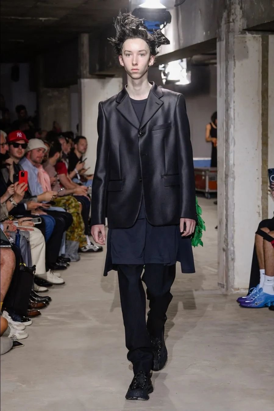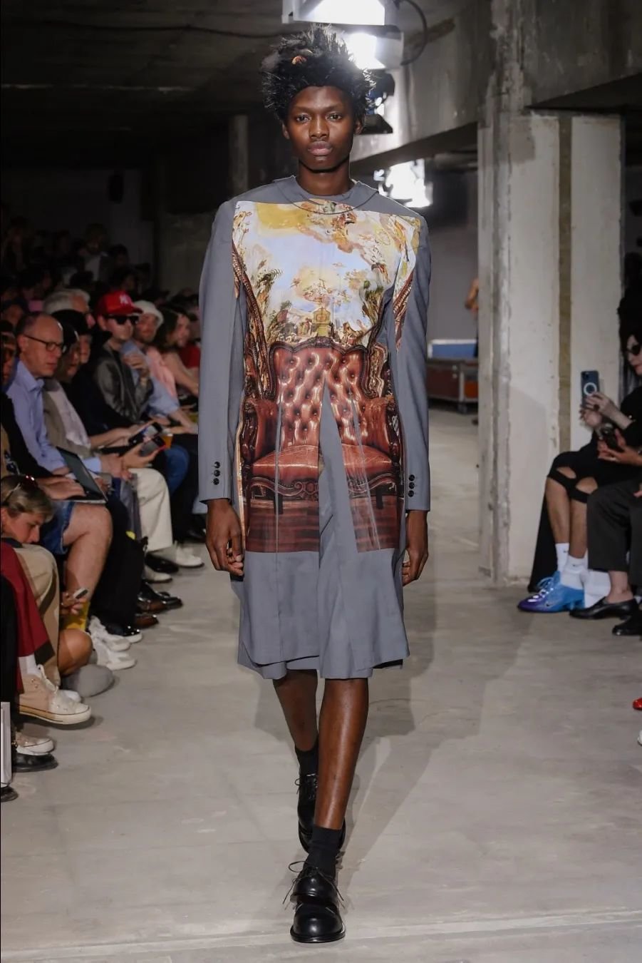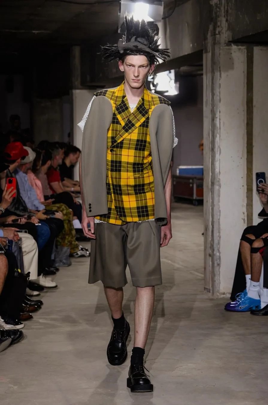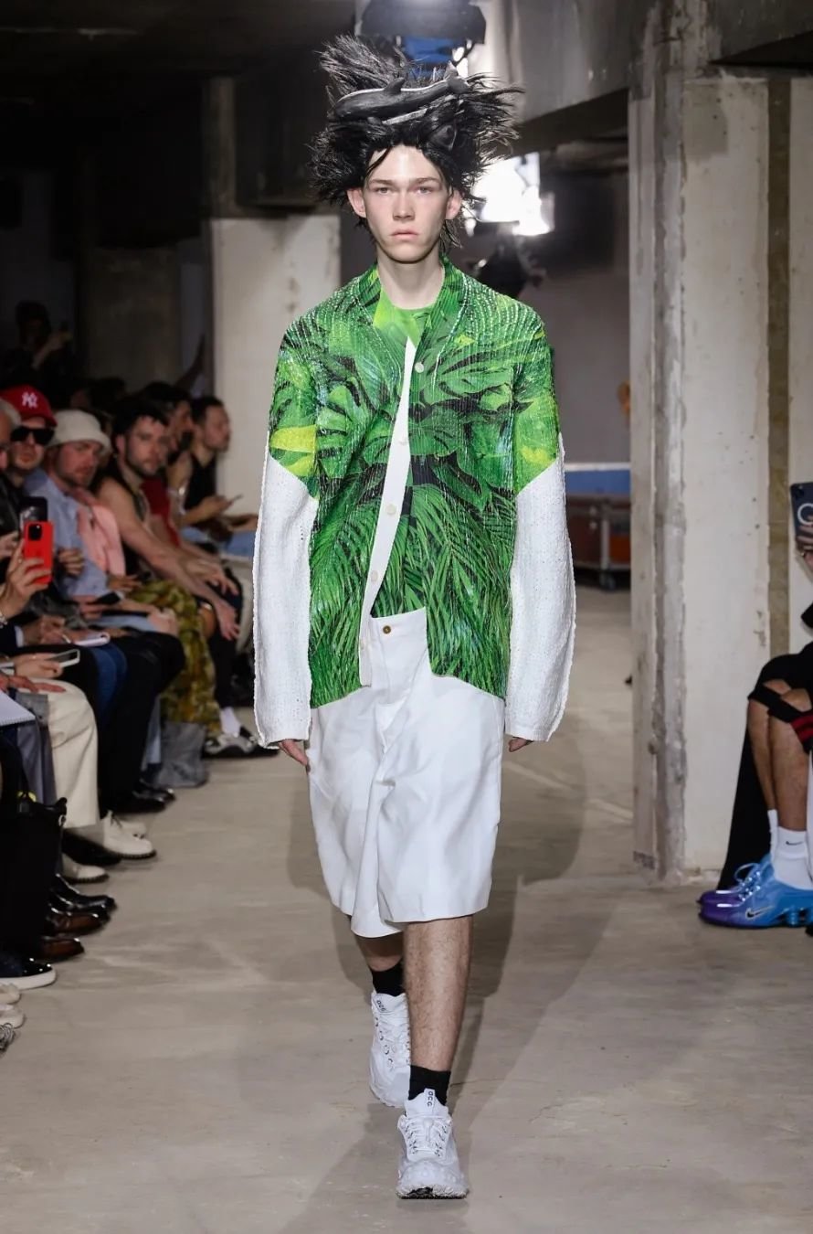 日本设计师川久保玲(Rei Kawakubo)展示了一场前卫的男装秀。她以窗帘为灵感,将西装后背分割并用系带收紧。她大胆尝试了颠覆性的设计,如倒挂的袖子、拼接的夹克和裤脚上翻。独特的印花和非常规材质的结合给秀场带来惊艳。